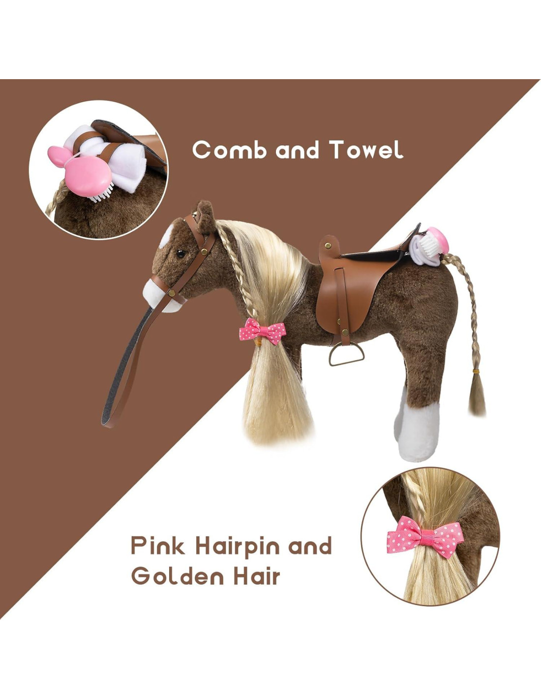 - Comience a jugar de manera imaginativa y diviértase con el hermoso caballo de peluche que presenta un largo cabello rubio sedoso, una silla de montar de cuero realista y lindos accesorios