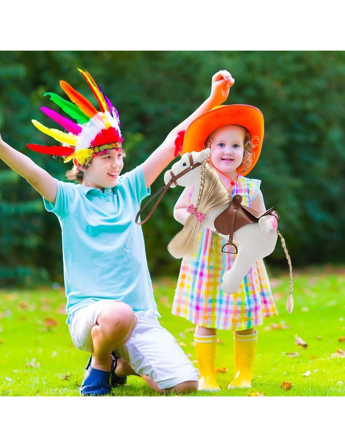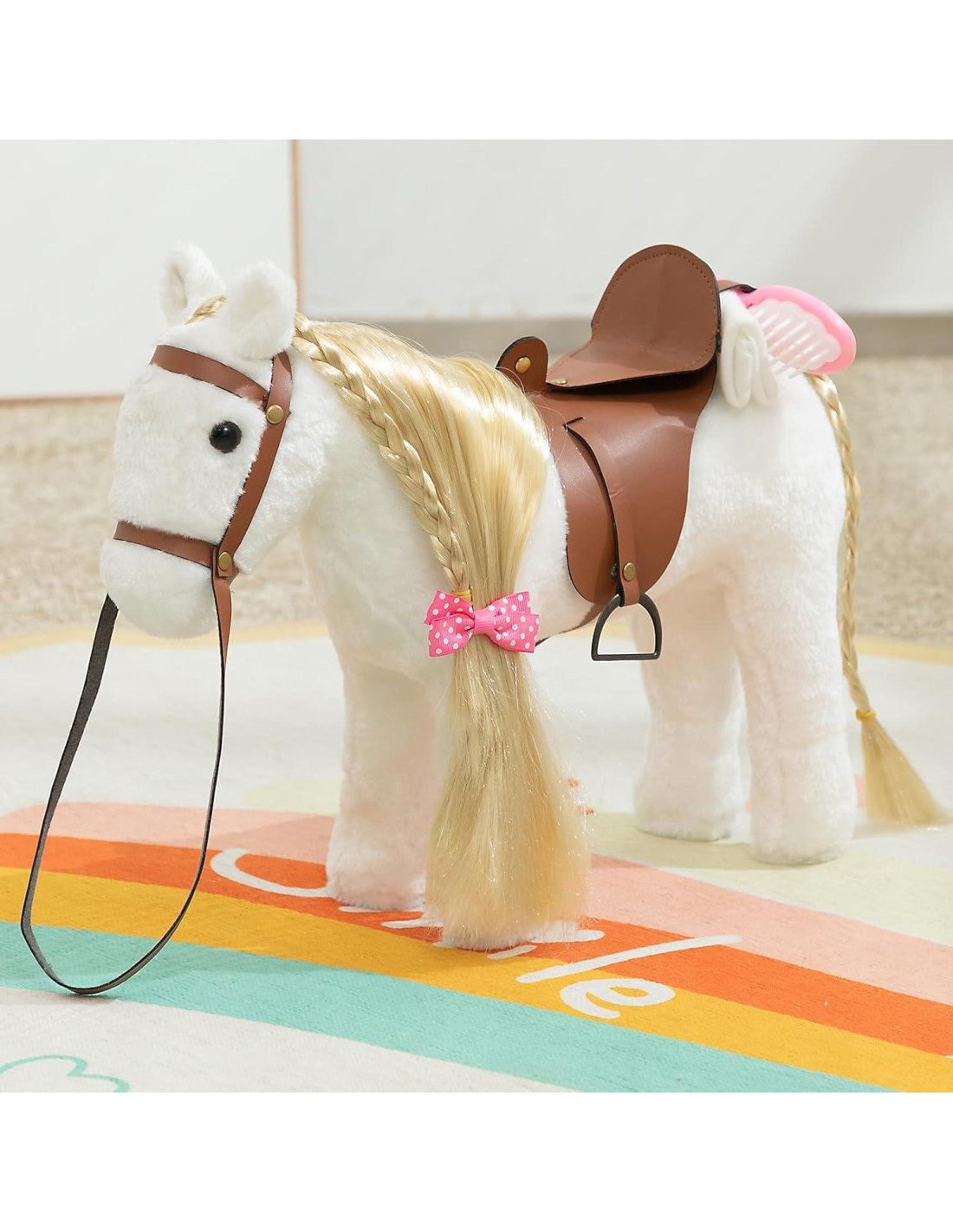 - Comience a jugar de manera imaginativa y diviértase con el hermoso caballo de peluche que presenta un largo cabello rubio sedoso, una silla de montar de cuero realista y lindos accesorios