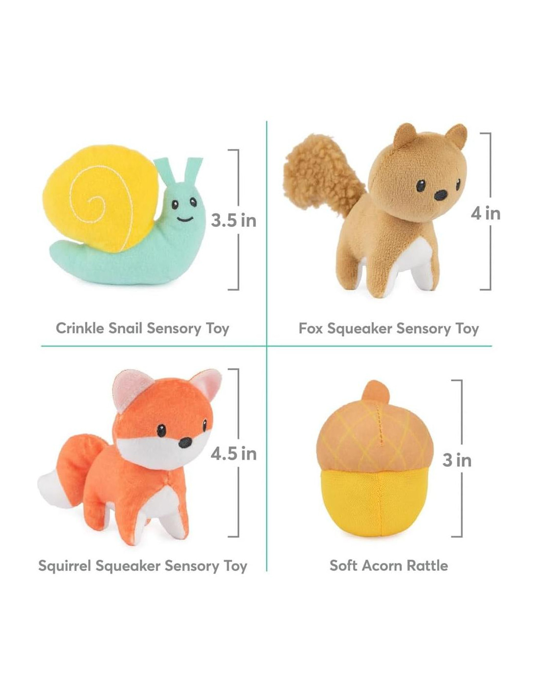 - La compra es por un set de 5 piezas que contiene cuatro juguetes de peluche que estimulan los sentidos: el suave zorro de peluche y la ardilla hacen sonidos de chirrido cuando se aprietan, el caracol azul y amarillo produce un crujido satisfactorio, y la bellota suena con un suave tintineo.