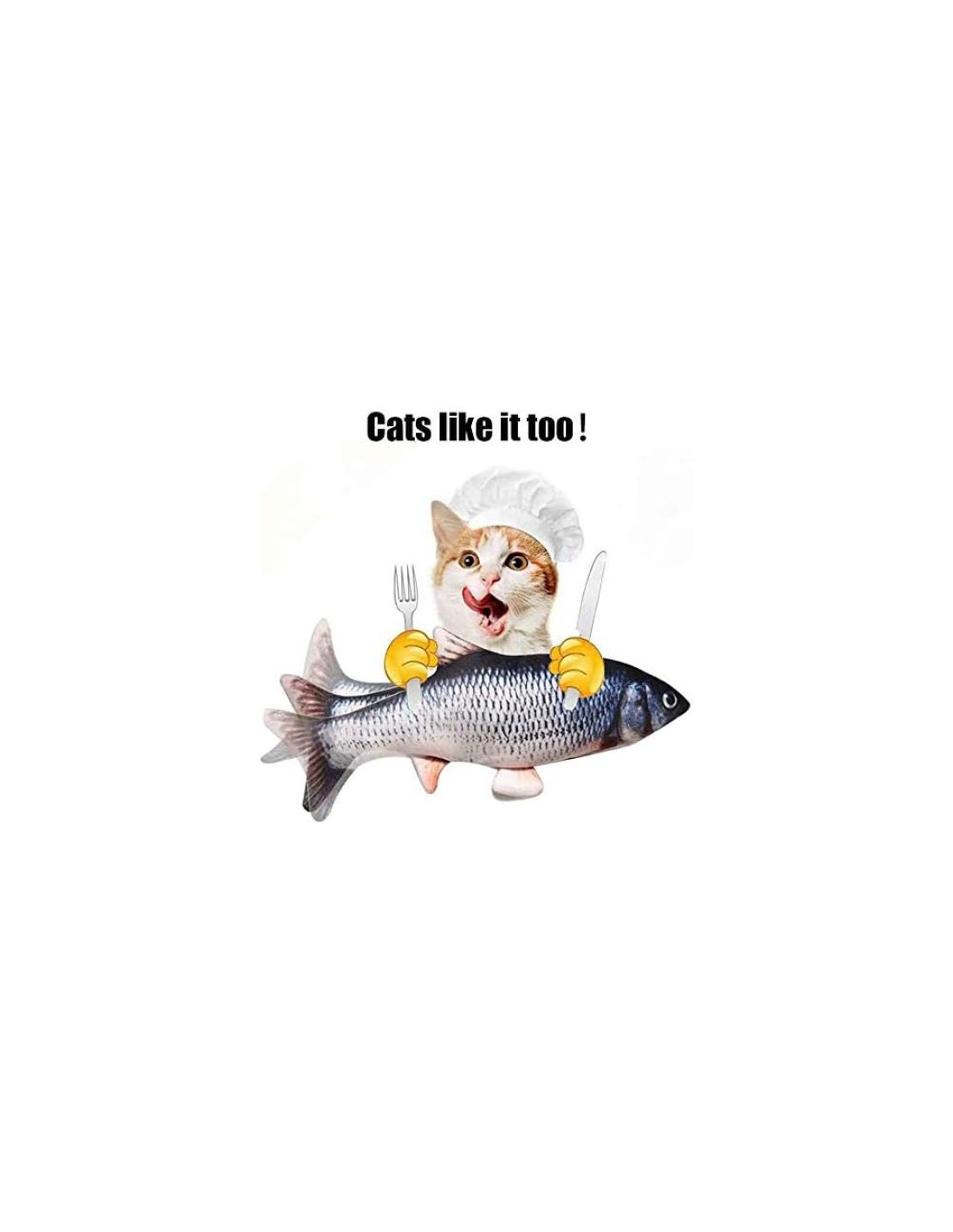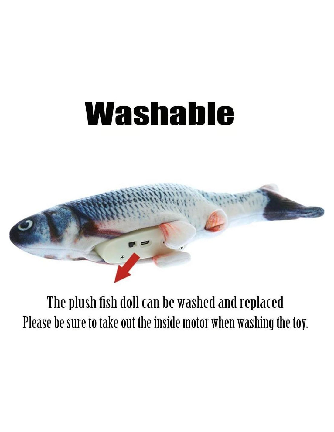- Juguete de pez de peluche realista: Usando proceso de impresión 3D, diseño de forma de pez claro y realista. El juguete de pez eléctrico parece un pez real. Este pez no debe ser colocado en agua. Si necesita ser limpiado, asegúrese de sacar el motor en el vientre antes de lavar el juguete.