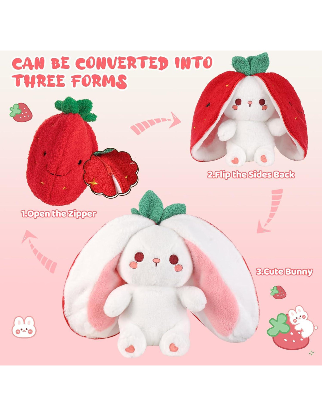 - Diseño Reversible de Conejo de Fresa - ¡Un juguete de muñeca de conejo, tan lindo! Este peluche de conejo presenta dos estilos adorables en uno: voltea entre un conejo blanco esponjoso o un dulce amigo temático de fresa para aventuras de abrazos sin fin.