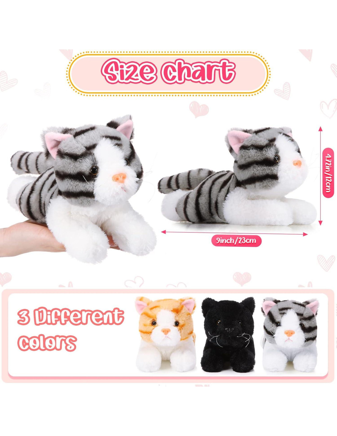 - Tamaño Adecuado: 3 lindos gatitos de aproximadamente 23 cm en posición acostada, descansando como postura, te hace sentir relajado y cómodo, ideal para que los niños jueguen y decoren fiestas