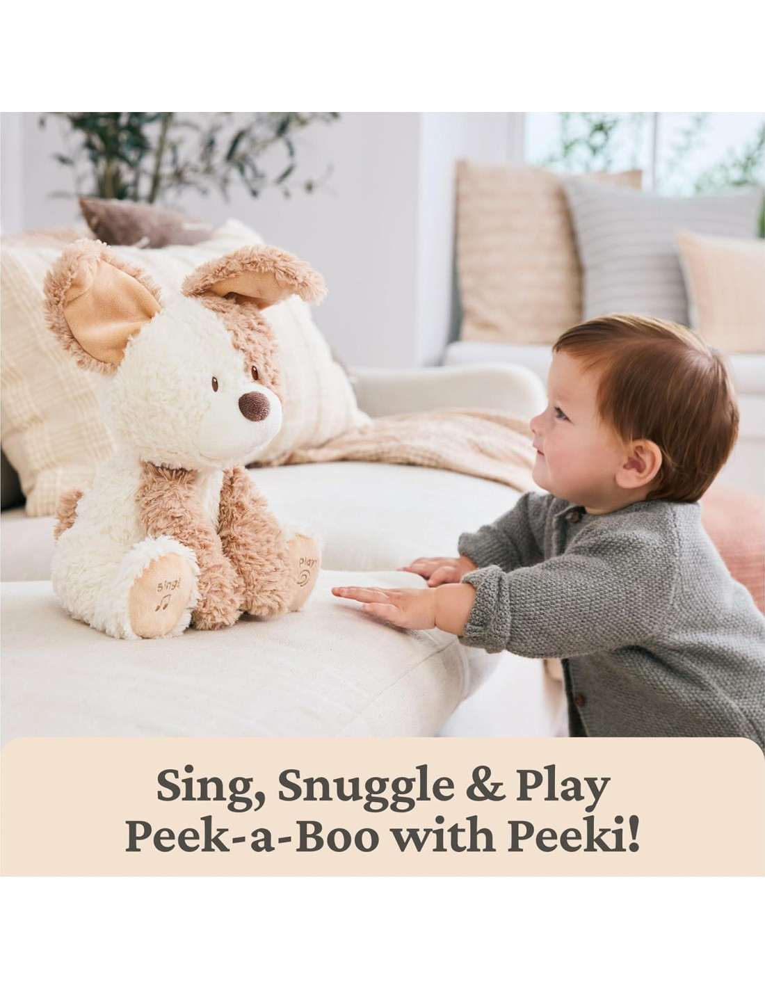 GUND Baby se enorgullece de presentar a Peeki, ¡el perrito que juega al peek-a-boo! Este innovador y adorable perrito manchado es la última adición a la colección de peluches animados de GUND Baby, convirtiendo las citas de juego en divertidas sesiones de exploración táctil y acogedora. Tan pronto como se enciende el interruptor de Peeki, cobra vida y saluda al bebé con una linda voz infantil, preguntando si quiere jugar al peek-a-boo. Luego, los padres y hermanos pueden presionar una de las almohadillas de las patas de Peeki para activar un juego o canción entretenida para el bebé. ¡Presiona la pata derecha de Peeki para comenzar un divertido y tonto juego de peek-a-boo! Peeki usa sus cortas y flexibles orejas para cubrir sus ojos y esconderse, echando de vez en cuando un vistazo al bebé con solo una oreja. Luego, para una divertida sorpresa, presiona la almohadilla de la pata izquierda de Peeki - ¡Peeki canta una única canción de peek-a-boo! Este perrito acogedor también fue hecho para sesiones de abrazos y cuenta con un suave pelaje de crema y arena con un hocico suave, nariz marrón chocolate y ojos bordados a juego. La dulce expresión y voz de Peeki harán que tus pequeños se rían y estén listos para jugar. Apto para edades de 6 meses en adelante. Cada perrito de peluche requiere 3 pilas AA (incluidas). Lavable en superficie; se envía en una bolsa de polietileno protectora.