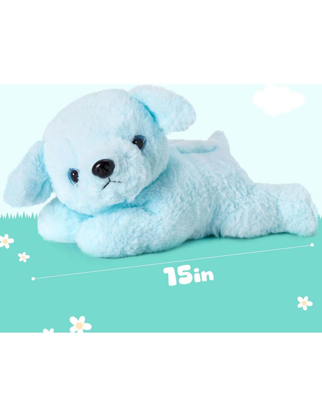 - ADORABLE CACHORRO - El perro azul que canta de peluche mide aproximadamente 15 pulgadas (38.1 cm) de largo y 7.5 pulgadas (19.05 cm) de alto, lo que es un tamaño abrazable para abrazar y acurrucar. Está acostado sobre su estómago con sus dos grandes orejas caídas, además, sus dos ojos acuosos añaden más dulzura al perro de peluche. Todo el gran diseño lo convierte en un juguete de perro abrazable.