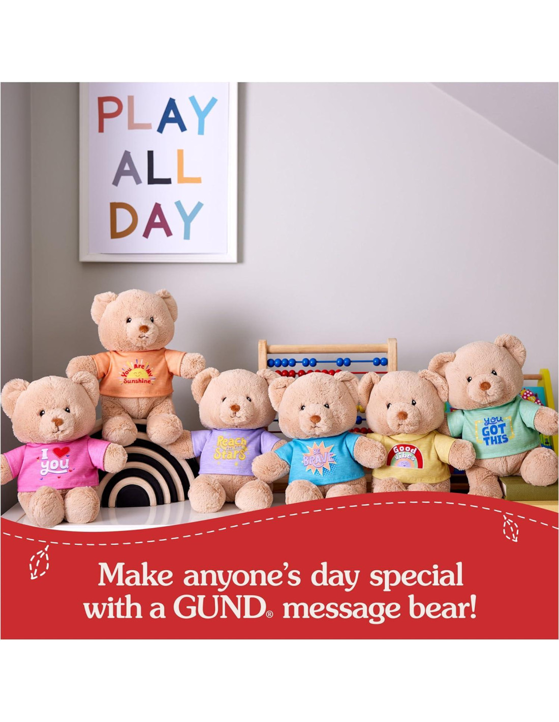 ¡Dilo en voz alta con un oso de mensaje GUND! Estos adorables y súper suaves osos de peluche capturan diseños clásicos con mensajes especiales impresos en camisetas vibrantes, ayudando a compartir dulces sentimientos y celebrar ocasiones con cualquiera. Ya sea para desearles suerte o simplemente mostrarle a alguien que te importa, los osos de mensaje GUND son una forma reflexiva de decirlo con un abrazo y una sonrisa. Estos adorables osos de peluche marrón de 30.48 cm presentan brazos abiertos, sonrisas felices y características bordadas que los hacen seguros para todas las edades. Cada oso lleva una camiseta vibrante y colorida con un mensaje, que presenta frases divertidas y alentadoras como, "Te Quiero", "Sé Valiente", "Buenas Vibras", "Tú Puedes", "Alcanza las Estrellas", y "Eres mi Sol Brillante". ¡Haz que el día de alguien sea especial con un oso GUND abrazable! Como todos nuestros osos de peluche, los osos de mensaje GUND son lavables a mano y apropiados para edades de 1 y más. No lavar a máquina ni usar limpiadores químicos agresivos.
