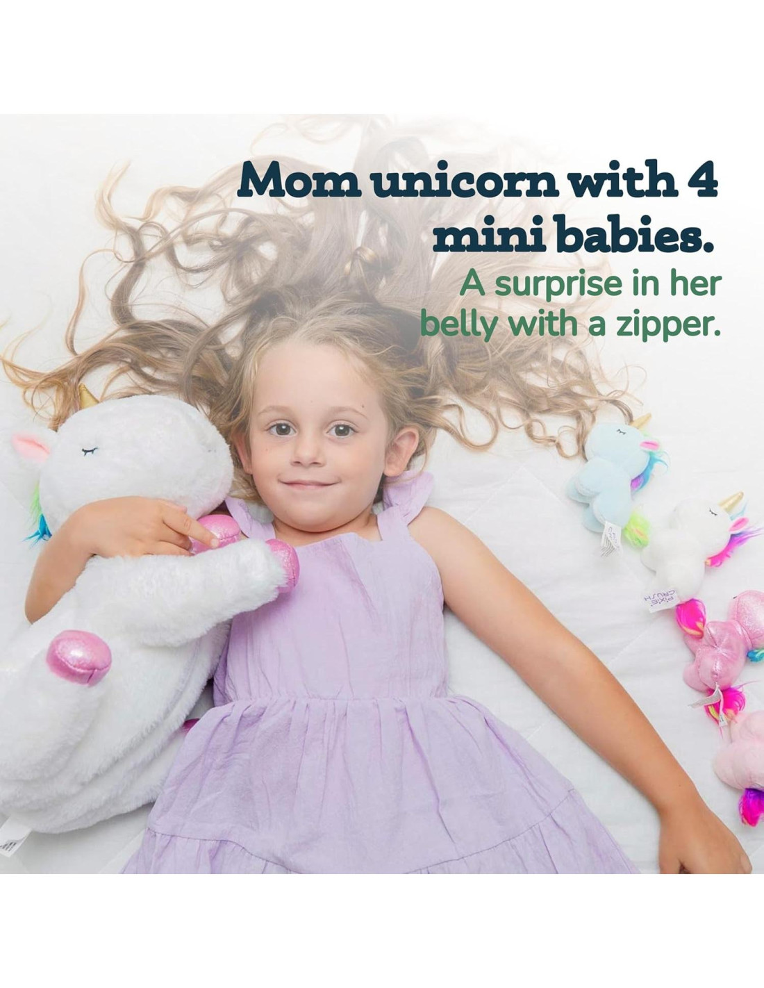 - Set de Cinco Juguetes de Peluche: Descubre la magia de encontrar cuatro adorables bebés unicornio dentro de la mamá de peluche. Descomprime a la mamá unicornio con bebés para una sorpresa encantadora; perfectos juguetes de peluche unicornio para niñas de 3 años en adelante