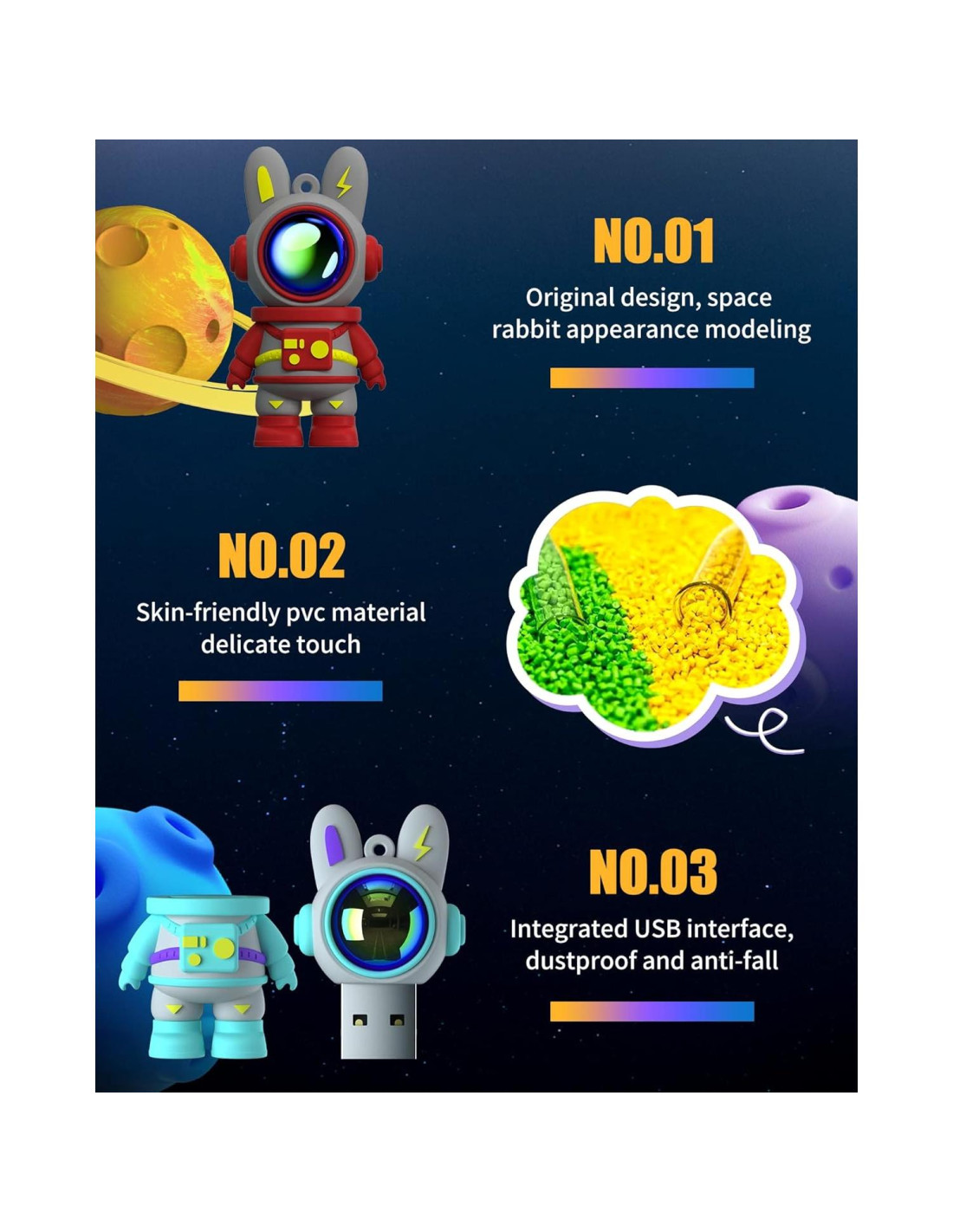 - Portable Cool Novelty Flash Drive --- Contiene 4 colores adorables en forma de conejo espacial para elegir. Hecho de material de goma PVC suave, blando y duradero, tamaño pequeño y práctico que puedes poner en tu bolsillo o bolso. También hay un agujero para llavero en la unidad USB, y te ayuda a adjuntarlo a tu mochila o billetera, llevando los datos a donde quiera que vayas.