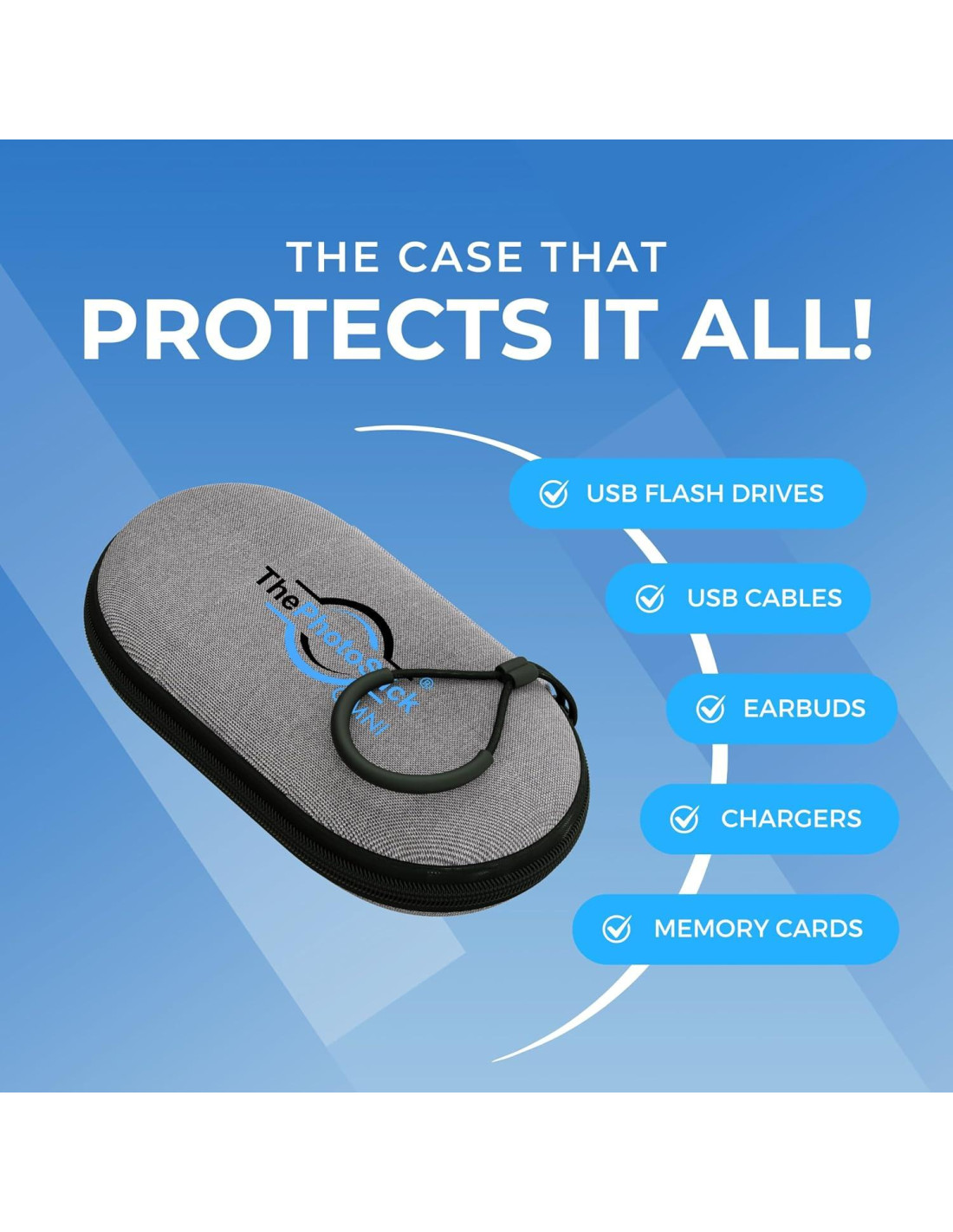 - Protección Simple y Efectiva - Respaldar tus preciados recuerdos en ThePhotoStick Omni es solo el primer paso. Asegúrate de que tus unidades nunca sean vulnerables protegiéndolas dentro de nuestra duradera funda protectora.