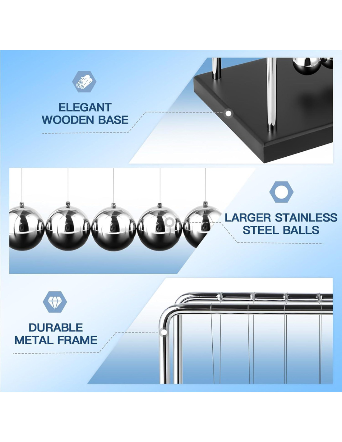 - Duradero y de calidad premium: Fabricado con un resistente marco de acero inoxidable y una base de madera pulida, este péndulo de Newton de alta calidad asegura un rendimiento duradero para el uso diario.