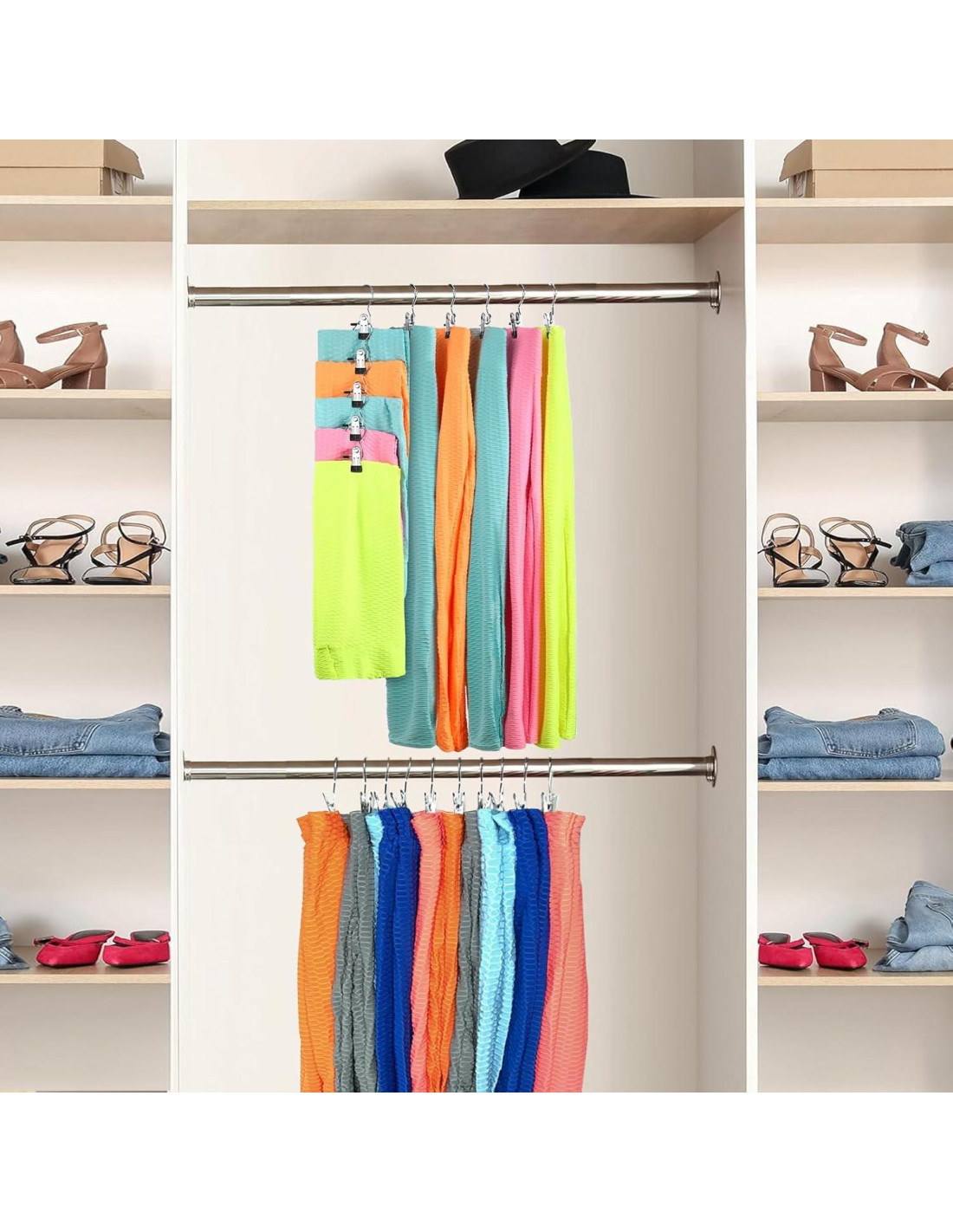 - Fácil de Usar - Este organizador de leggings para closet adopta un diseño integrado, no necesitas instalarlo. Las perchas de metal para pantalones de yoga se pueden colgar directamente en el closet sin ocupar espacio extra, manteniendo el closet ordenado y ahorrando mucho espacio en una habitación desordenada.