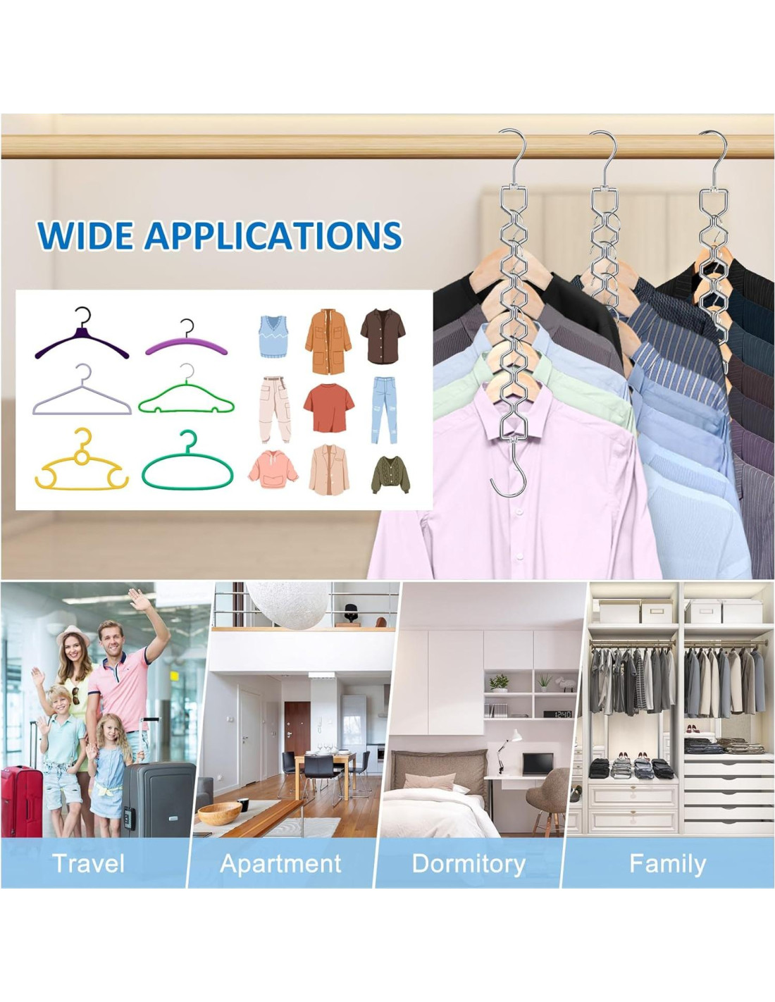 - Uso Multifuncional: Las perchas ahorradoras de espacio pueden usarse horizontal y verticalmente. Las perchas de metal colapsables pueden almacenar ropa de temporada; abrigos de invierno pesados; camisas; pantalones; chaquetas; suéteres; jeans; vestidos o accesorios, pueden ayudar a que la ropa se seque más rápido con la ventilación adecuada. Adecuadas para apartamentos; dormitorios; closets pequeños; habitaciones; escuelas; universidades; lavanderías; viajes; casas rodantes; hogar, también podrían ser un regalo para cumpleaños; día de la madre; inauguración de casa; Navidad, etc.