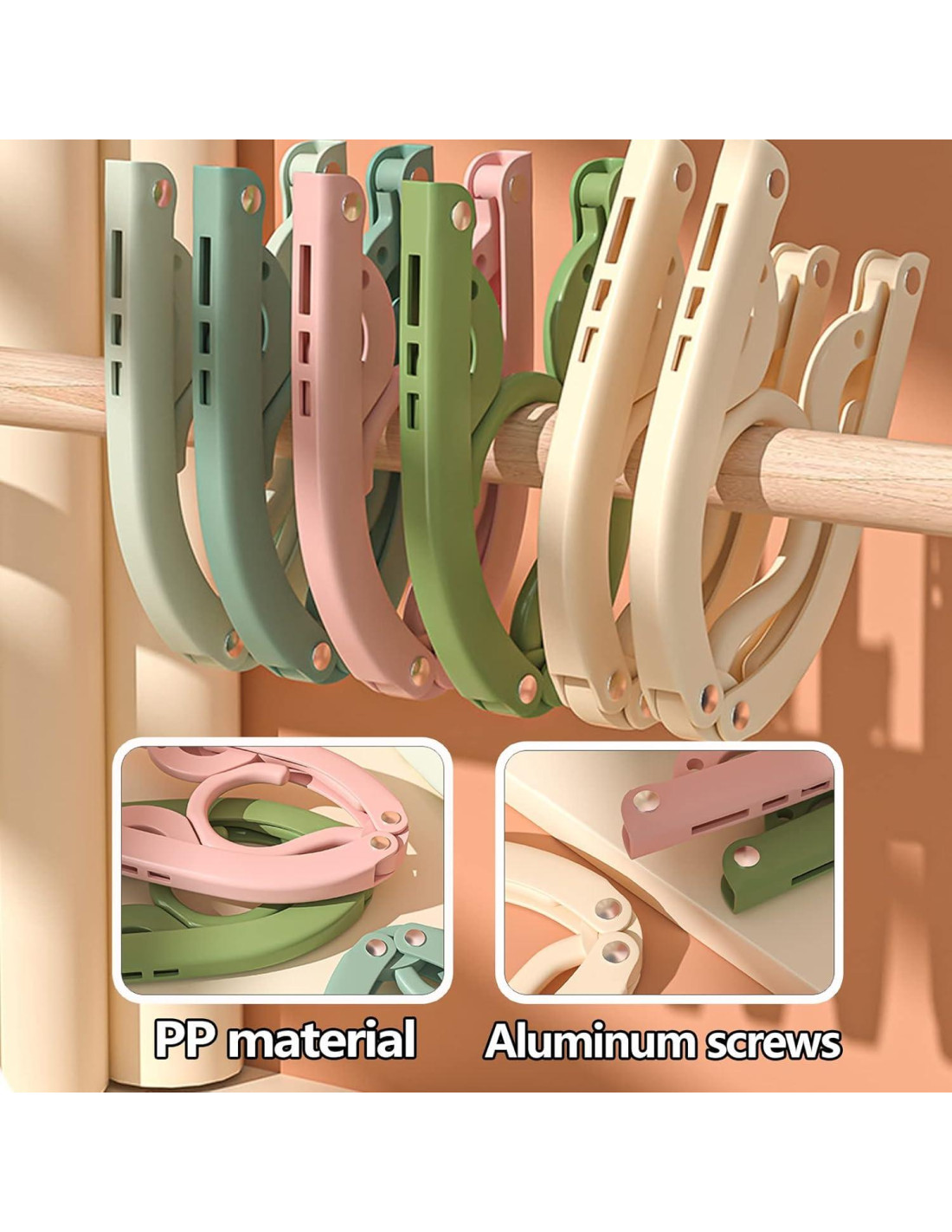 - Perchas de ropa antideslizantes: El extremo de la percha plegable tiene un diseño antideslizante que sujeta la ropa de forma segura y evita que se deslice. Cada percha de viaje viene con dos clips removibles, que se pueden usar con la percha o quitar para uso separado
