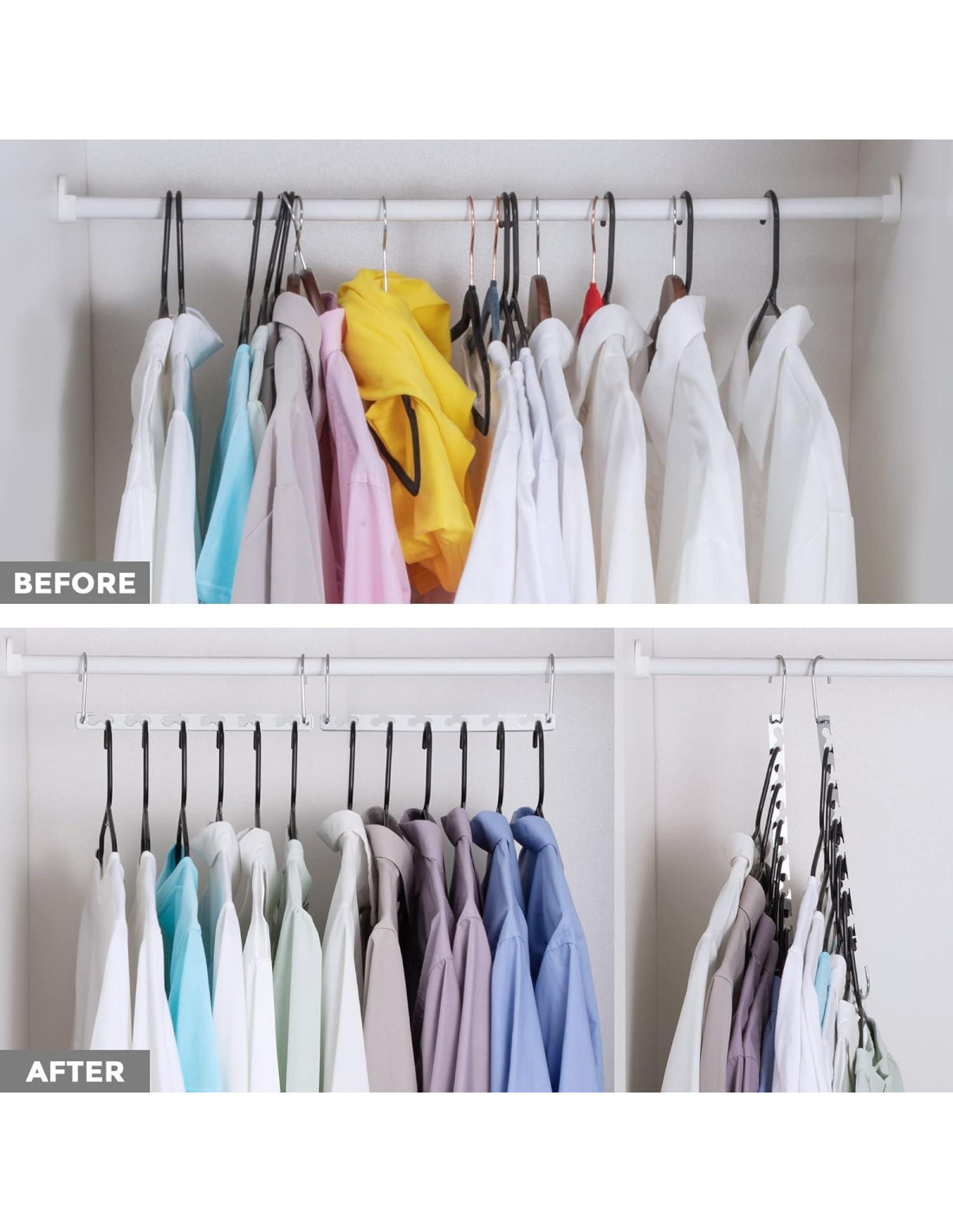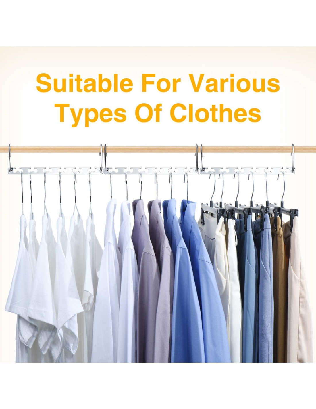 - Percha Ahorra Espacio de Diseño Nuevo - Cada percha de ropa tiene 6 ranuras para evitar que la ropa se deslice y caiga, y cada ranura sostiene 2 perchas. Nuestras perchas en cascada también cuentan con ganchos mucho más grandes (4.1 cm) que pueden adaptarse a una gama más amplia de diámetros de varillas de closet.
