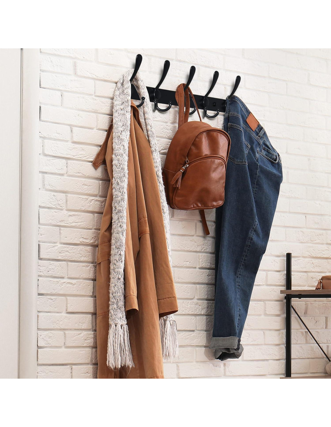 - 4. CUELGA MUCHO: Con 5 ganchos triangulares, el perchero montado en la pared puede sostener mucho, como abrigos, sombreros, toallas, bolsos, bufandas, batas; Ideal para entradas, cuartos de barro, dormitorios, armarios, cocinas, baños, y más.