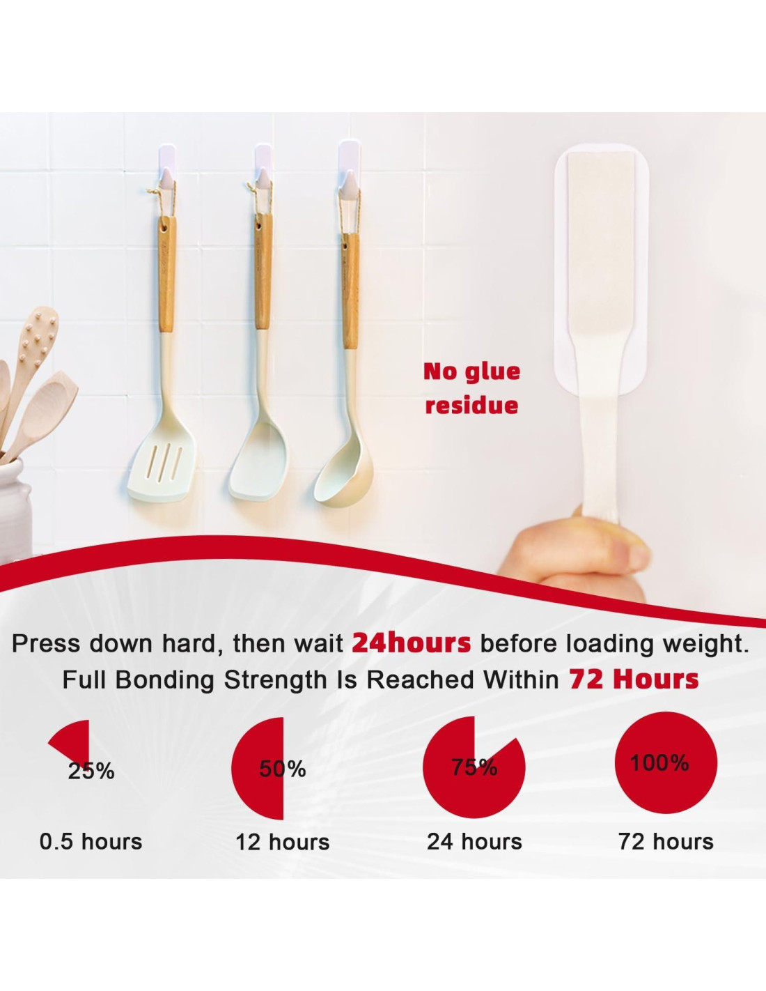 - Directrices de Uso y Retiro: Aplicación: Presiona las tiras adhesivas firmemente durante 30 segundos, coloca la cubierta del gancho y permite 24 horas para que el adhesivo alcance su máxima resistencia. Evita colgar ganchos sobre camas o en papel tapiz, y abstente de suspender objetos valiosos. Retiro: Toma suavemente la parte superior de la tira adhesiva y tira lentamente y recto hacia abajo hacia el suelo para retirar el gancho limpiamente, protegiendo la superficie de la pared. Para reutilizar, simplemente compra tiras adhesivas de repuesto.