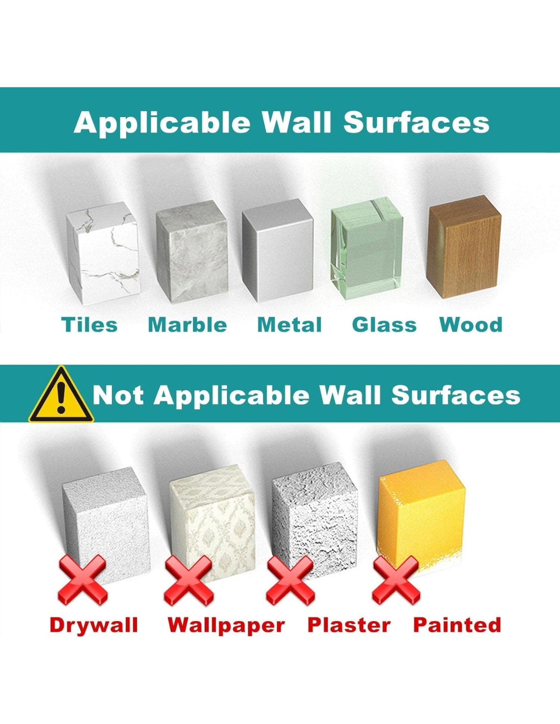 - IMPORTANTE: Será mejor esperar 24 horas antes de colgar los ganchos para toallas de baño después de la instalación. No se recomienda usar este gancho en paredes de cal, paredes de yeso, superficies rugosas en paredes secas y papel tapiz texturizado