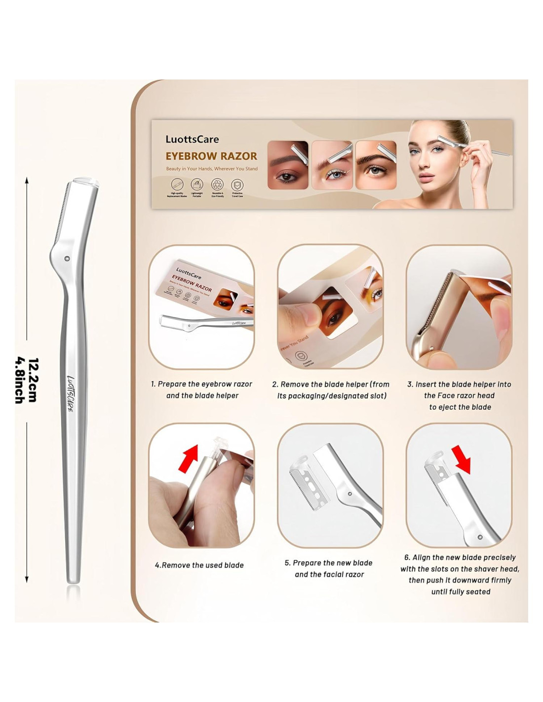 - CÓMO USAR: 1. Antes de eliminar el vello, mantenga su piel hidratada antes de usar; 2. Luego, retire la tapa y incline la rasuradora facial a un ángulo de 30 y deslice hacia abajo con una presión suave en las zonas con vello; 3. Enjuague la cara y aplique hidratante/serum dentro de 3 minutos (bloquee la hidratación); 4. Limpie la cuchilla: enjuague bajo agua tibia O limpie con un paño de alcohol;