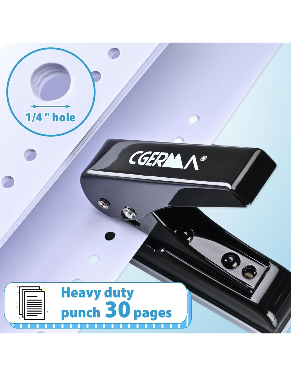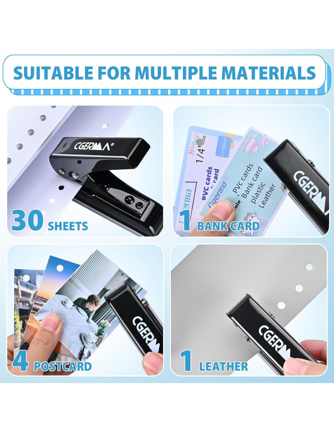 - AHORRO DEL 60% EN MANO DE OBRA Como la cabeza de cortador afilada, se pueden perforar fácilmente 30 hojas con esta perforadora de alta resistencia, y asegura que la tarjeta de metal y plástico ultra delgada se pueda perforar sin esfuerzo.