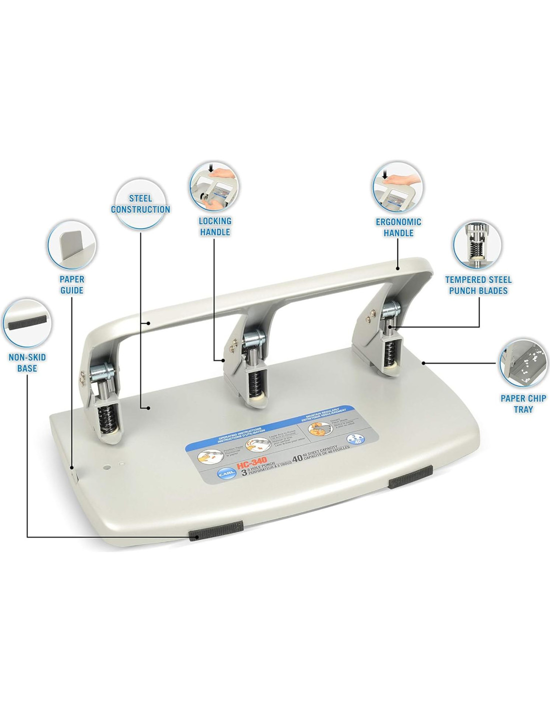 La perforadora de 3 agujeros de alta resistencia es potente, conveniente, compacta y elegante. Esta perforadora de papel extremadamente duradera, pero asequible, puede perforar hasta 40 hojas de papel Bond estándar de 20 lb (9.07 kg). La HC-340 tiene un mango sobredimensionado para facilitar la perforación de papel con la mano abierta y está preestablecida para perforar agujeros de 9/32" (7.14 mm) de diámetro para carpetas de 3 anillas estándar. La HC-340 cuenta con un mango que se bloquea para almacenamiento y seguridad, una bandeja de desechos de gran capacidad, una base antideslizante para mayor estabilidad, un patrón de perforación de 3 agujeros estándar. La HC-340 es robusta y duradera gracias a su construcción de acero de alta resistencia. La guía de papel incorporada asegura una colocación perfecta. La combinación de colores agradable a la vista complementa cualquier decoración de oficina.