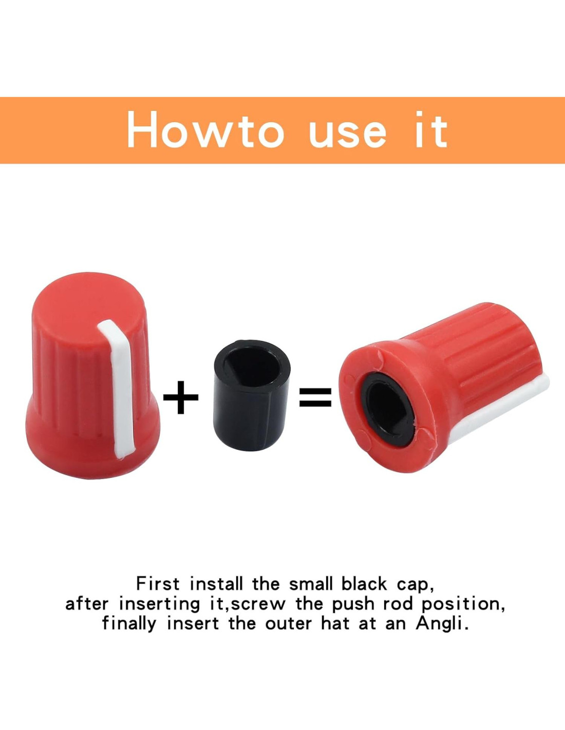 - [ Tamaño ] Se adapta a agujero de eje tipo D Diámetro: 0.236" (6mm), Tamaño: 15 x 19mm. Cada paquete contiene 5 perillas, una de cada color Negro, Azul, Rojo, Naranja y Amarillo.