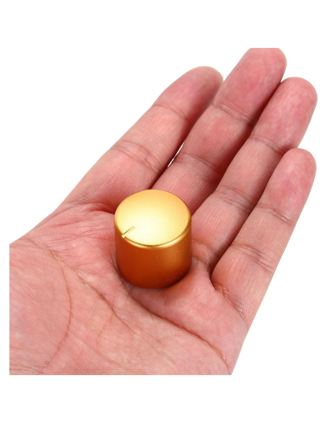 ¿Qué es? La perilla de potenciómetro de aluminio es un accesorio común para el ajuste de sonido. A menudo se utiliza como un botón de ajuste para guitarras, bajos, AMPS y otros equipos musicales. Es un gran reemplazo de perilla para los amantes de la música. ¿Qué recibiré? Perilla de Potenciómetro de Aleación de Aluminio Tamaño: 25 x 23 mm (OD x H); Material: Aleación de Aluminio; Diámetro del Orificio de Montaje: 6mm (1/4 de pulgada); Color: Dorado; En el paquete: 3 Pcs x Perilla de Potenciómetro; 1 Pcs x Llave; ¿Hay alguna ventaja de este producto? Durabilidad Sobresaliente: Esta perilla de control de volumen y tono está hecha de aleación de aluminio, que no solo es ligera sino que también tiene una excelente durabilidad, asegurando su uso a largo plazo. Gran adaptabilidad: Esta perilla de potenciómetro tiene un orificio de montaje estándar de 1/4" (6mm) que puede adaptarse fácilmente a la mayoría de guitarras, bajos y otros instrumentos musicales, y se incluye una llave para facilitar la instalación. Aplicaciones Versátiles: Esta perilla de control tiene una amplia gama de aplicaciones y es muy adecuada para equipos de audio como guitarras, bajos, AMPS, Pedal de Efectos, etc. ¿Cómo usarlo? 1. Retire la perilla antigua de su dispositivo. 2. Mida y asegúrese de que el tamaño del tornillo de montaje coincida con el tamaño del orificio de montaje de nuestra perilla. 3. Alinee el orificio de montaje de la perilla e instálelo en la posición correspondiente, y use una llave para asegurarla. ¿Qué debo tener en cuenta? Antes de usar, asegúrese de que el tamaño del orificio de montaje de nuestros productos coincida con su equipo.