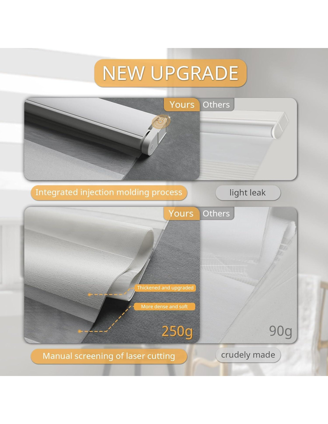 - CARACTERÍSTICA DEL TEJIDO: Las persianas zebra motorizadas con control remoto están hechas de tela de alta calidad. Se puede notar a simple vista. Y esta tela ha sido mejorada recientemente con bandas de tela más anchas para asegurar una privacidad completa. Mientras tanto, las persianas zebra sin cordones son 50% filtrantes, lo que las convierte en una opción óptima para habitaciones con clima tropical o ambientes húmedos.