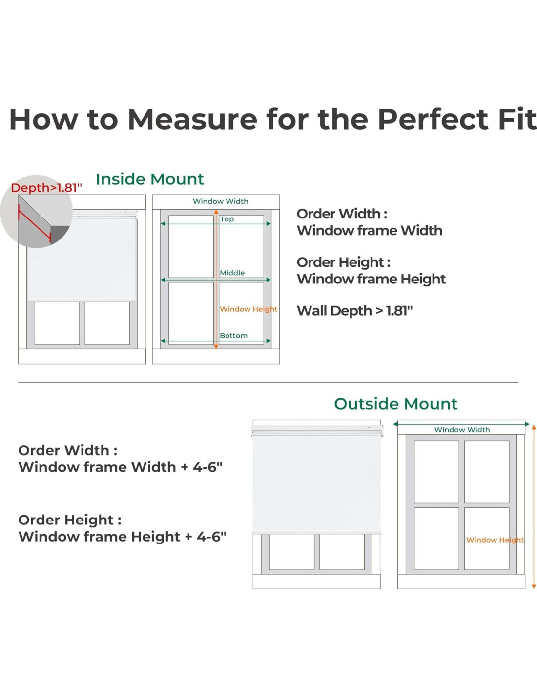 - Guía de Tamaño: Los marcos de ventanas interiores deben tener al menos 5 centímetros de profundidad. El ancho de la persiana debe ser de 0.25 a 0.5 centímetros más pequeño que el ancho de la ventana, creando pequeños espacios de luz a cada lado. Para un sombreado completo, elige la instalación exterior para evitar espacios de luz. La instalación exterior requiere que las persianas sean de 10 a 15 centímetros más anchas que el marco de la ventana para una mejor cobertura.