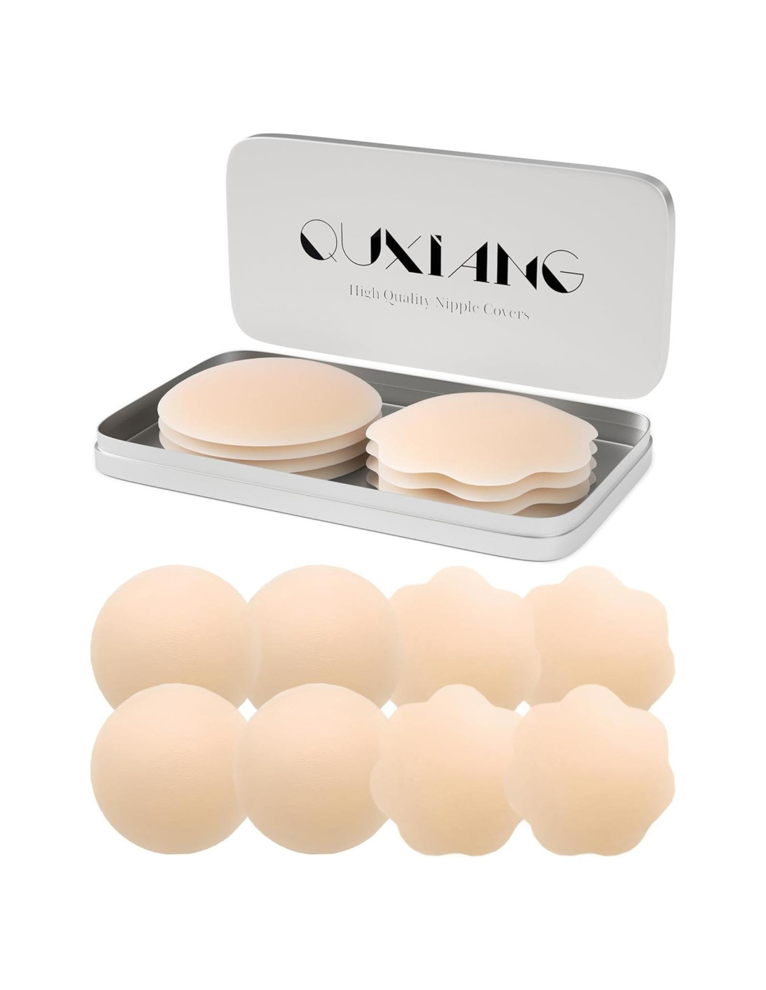tu corsé y sujetador sexy, guarda las tiras invisibles. tus hermosos senos, tus encantadoras clavículas y hombros. Esta noche, eres una dama elegante, también puedes ser encantadora y sexy. Cree en las Cubiertas de Pezones de Silicona, revelarás el estilo de tu ropa con más confianza. Fáciles de usar y quitar, aparecen sin costuras y naturales. Son hipoalergénicas, reutilizables y fáciles de limpiar con agua tibia y jabón. Pueden aplicarse en cualquier momento y ocasión, como cuando usas vestidos que revelan la espalda, mallas y vestidos de baño. Perfectas para atuendos sin espalda y sin tirantes. Ofrecemos una caja de almacenamiento de acero inoxidable QUXIANG, diseñada para ser lo suficientemente pequeña como para caber en un bolso. Lleva estos pétalos en tu bolso en cualquier momento y lugar para una solución de moda rápida. Paso 1: Lava los senos y los dedos. Paso 2: Descubre la película de polvo. Paso 3: Coloca la cubierta del pezón suavemente sobre el pezón, haciendo que el borde exterior se adhiera a la piel. No uses humectantes, perfumes, polvos u otros productos para el cuidado de la piel, porque esto reducirá el efecto del adhesivo. Siempre limpia tus pasties con agua tibia y jabón suave después de cada uso. No uses toalla. Simplemente sacude el exceso de agua, colócalos de nuevo en el paquete, evita que el polvo se acumule en el adhesivo. No los uses en piel dañada o inflamada. No los uses por más de 6 horas. No apto para madres lactantes. Reutilizables y Adhesivos y Hipoalergénicos de Silicona. tu corsé y sujetador sexy, guarda las tiras invisibles. tus hermosos senos, tus encantadoras clavículas y hombros.