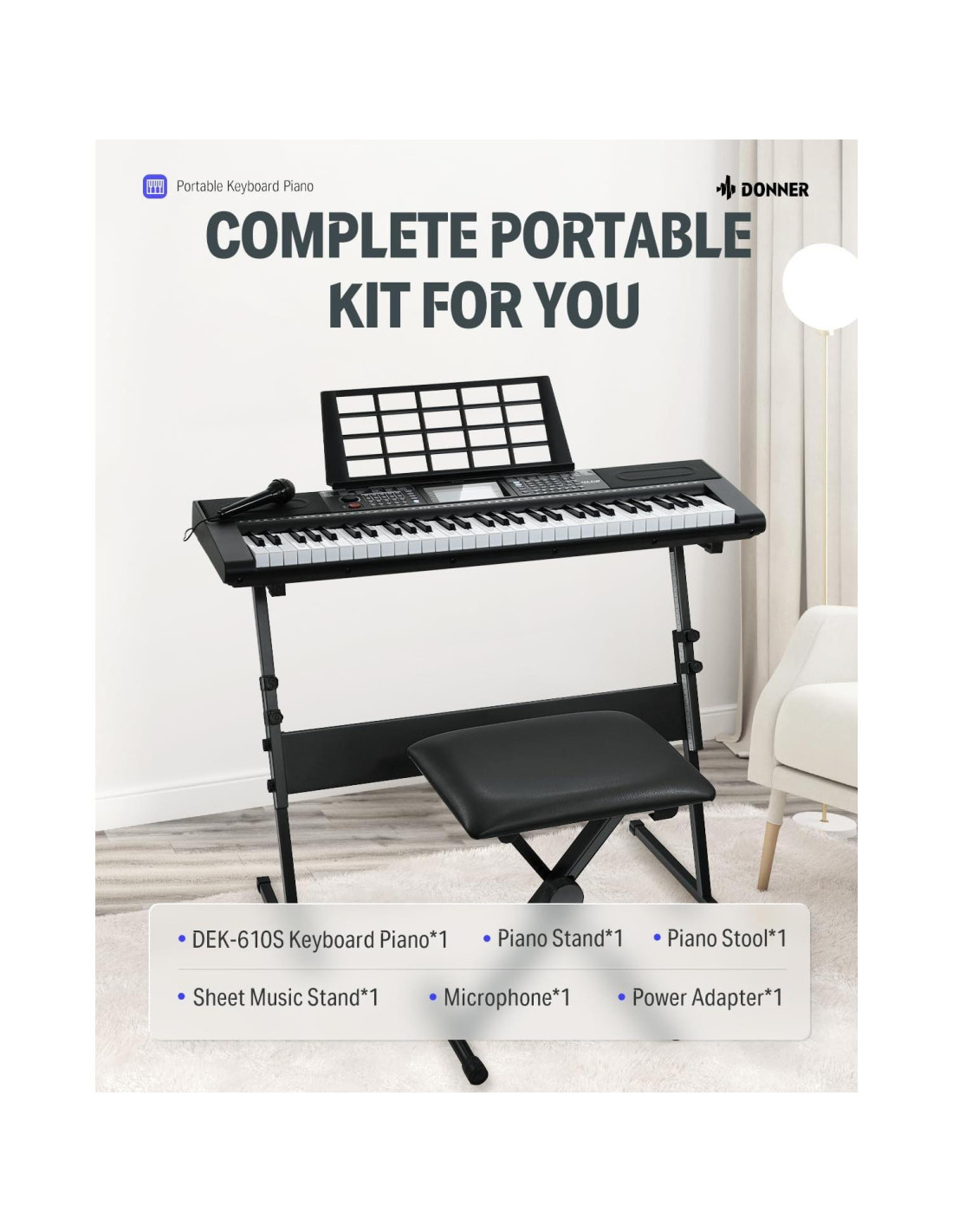 - Kit Todo Incluido - El Kit de Teclado de Piano DEK-610S incluye un soporte de teclado fácil de ensamblar, un banco de altura ajustable, un soporte para partituras, un micrófono y un adaptador de corriente. Proporciona todo lo que necesitas en un solo paquete.