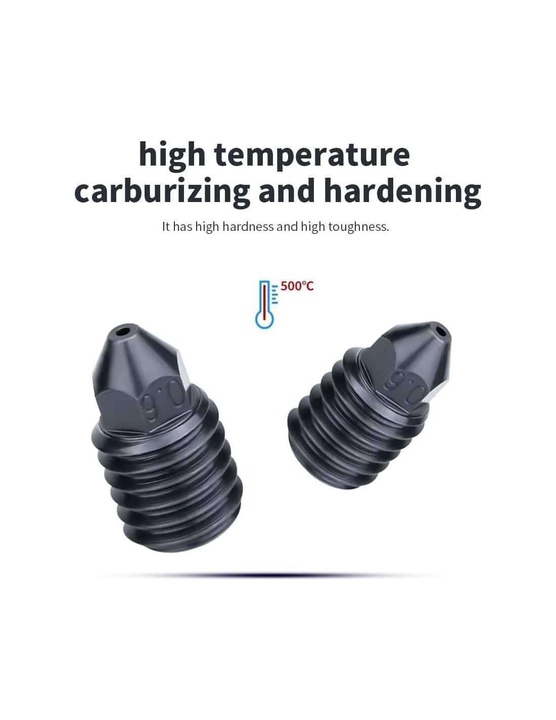 - Las boquillas están hechas de acero endurecido de alta calidad para durabilidad, las boquillas mejoradas están diseñadas para durar. Su construcción robusta asegura una excelente resistencia al desgaste, al calor y a la corrosión, lo que las hace ideales para impresión 3D a altas temperaturas.