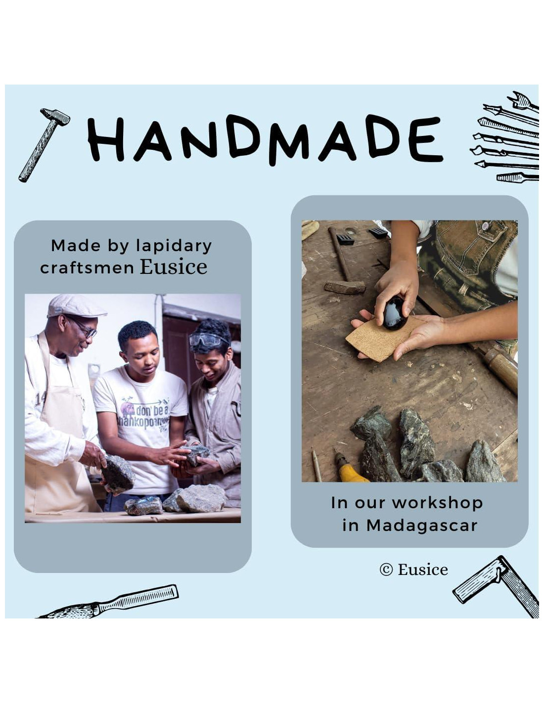 - PIEDRA NATURAL: Todas nuestras Ágatas de Cinta provienen de nuestro taller familiar, a 178 km de la capital de Madagascar, en las tierras altas de las montañas. Es aquí donde el padre de Judith (geólogo de profesión y fundador de Eusice) y su equipo de artesanos lapidarios trabajan las rocas naturales extraídas de la región en hermosas piedras de palma naturales y hechas a mano.