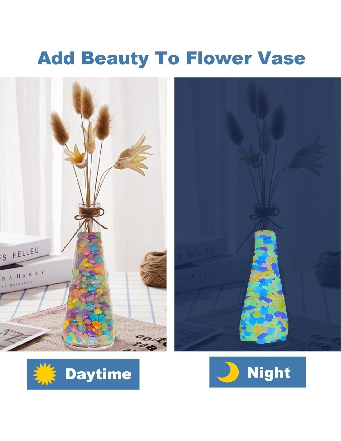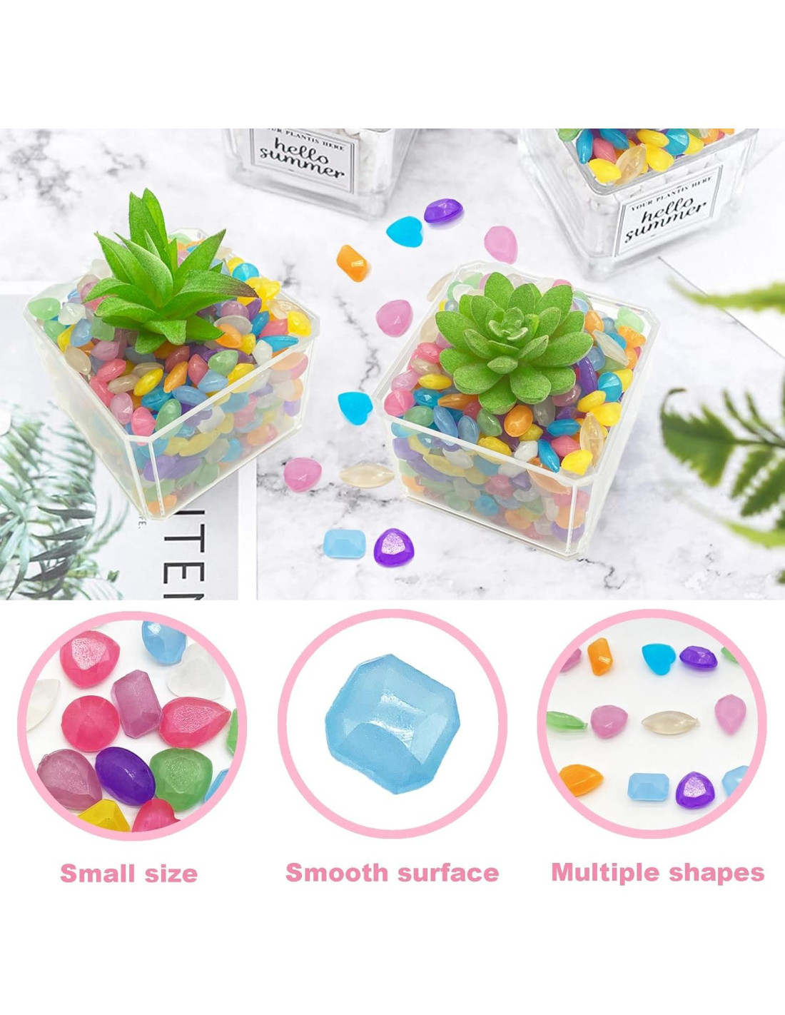 - Ampliamente Usadas: las pequeñas piedras brillantes son excelentes para decoración interior y exterior. se pueden usar para acuarios, jarrones, micro jardín de hadas, plantas en macetas, jardín, patio trasero, pasillo o entrada, etc. el brillo por la noche hace que tu hogar se vea más atractivo