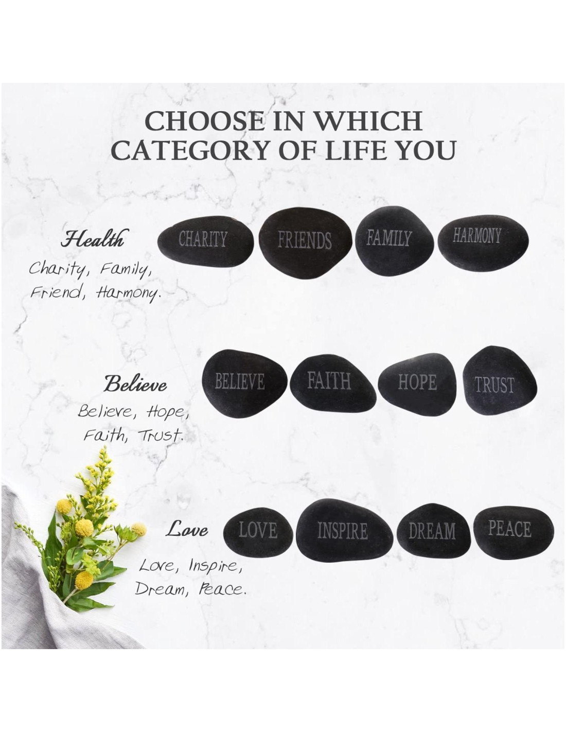 - Tamaño de 5.08 cm a 7.62 cm cada uno. Color Negro Natural. Conjunto de 12 Piedras Únicas, talladas con diferentes palabras de aliento, como Amigos, Fe, Familia, Sueño, Esperanza, Inspirar, Amor, Paz, Confianza, Armonía, Creer, Caridad.