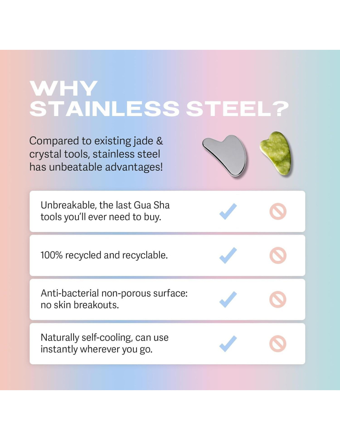 - 100% Acero Inoxidable: El gua sha corporal de acero inoxidable de Sacheu está hecho de acero inoxidable reciclado al 100%, un material duradero y no poroso que es fácil de limpiar y no se rompe fácilmente como otros materiales
