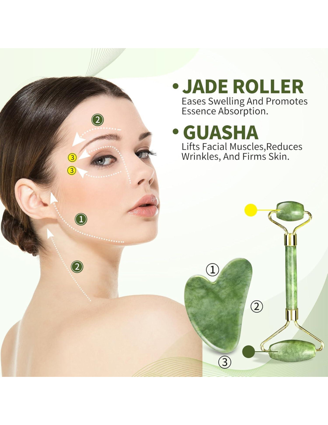 - Materiales de alta calidad: La herramienta facial Gua Sha y el rodillo de jade están hechos de material de jade verde natural, sin químicos ni irritantes. Los bordes son suaves y se ajustan perfectamente a la curva de la cara. El mango es ergonómico y fácil de agarrar.