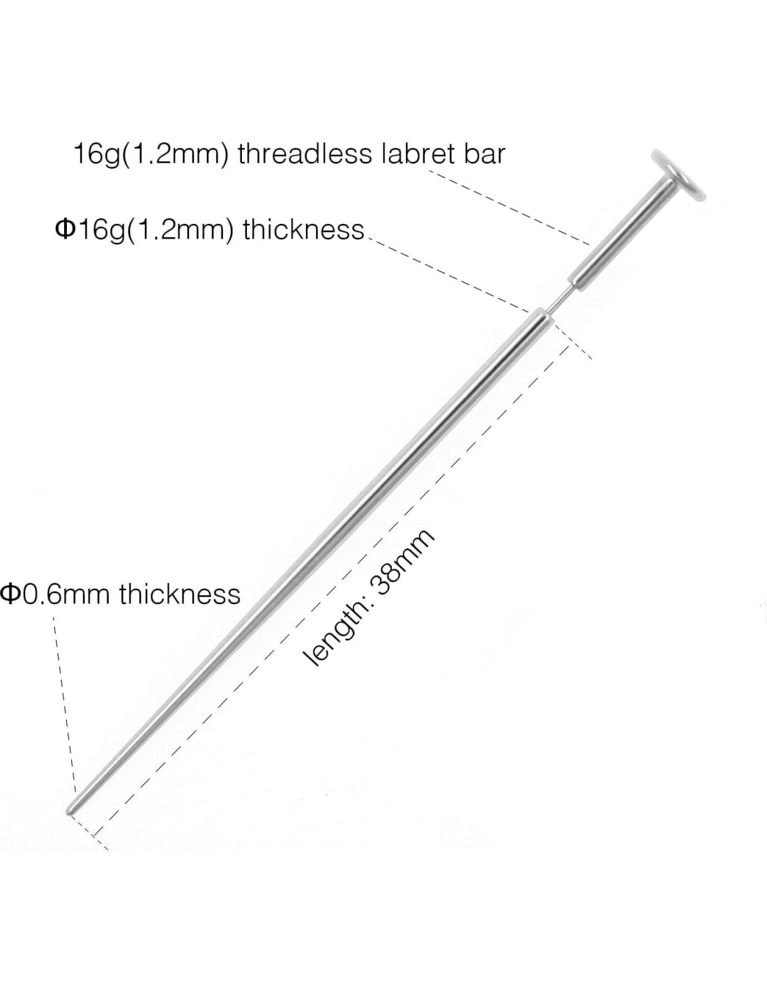 - Vendido como 2 PCS: un taper es 14ga(1.6mm) de grosor, otro es 16ga(1.2mm), Longitud: 38mm (aprox 1.5 pulgadas). Un pin delgado en el extremo (sin rosca/sin agujero). Material: titanio grado implante 6AL4VELI ASTM F-136, el titanio tiene una excelente biocompatibilidad y pesa la mitad que el acero quirúrgico.
