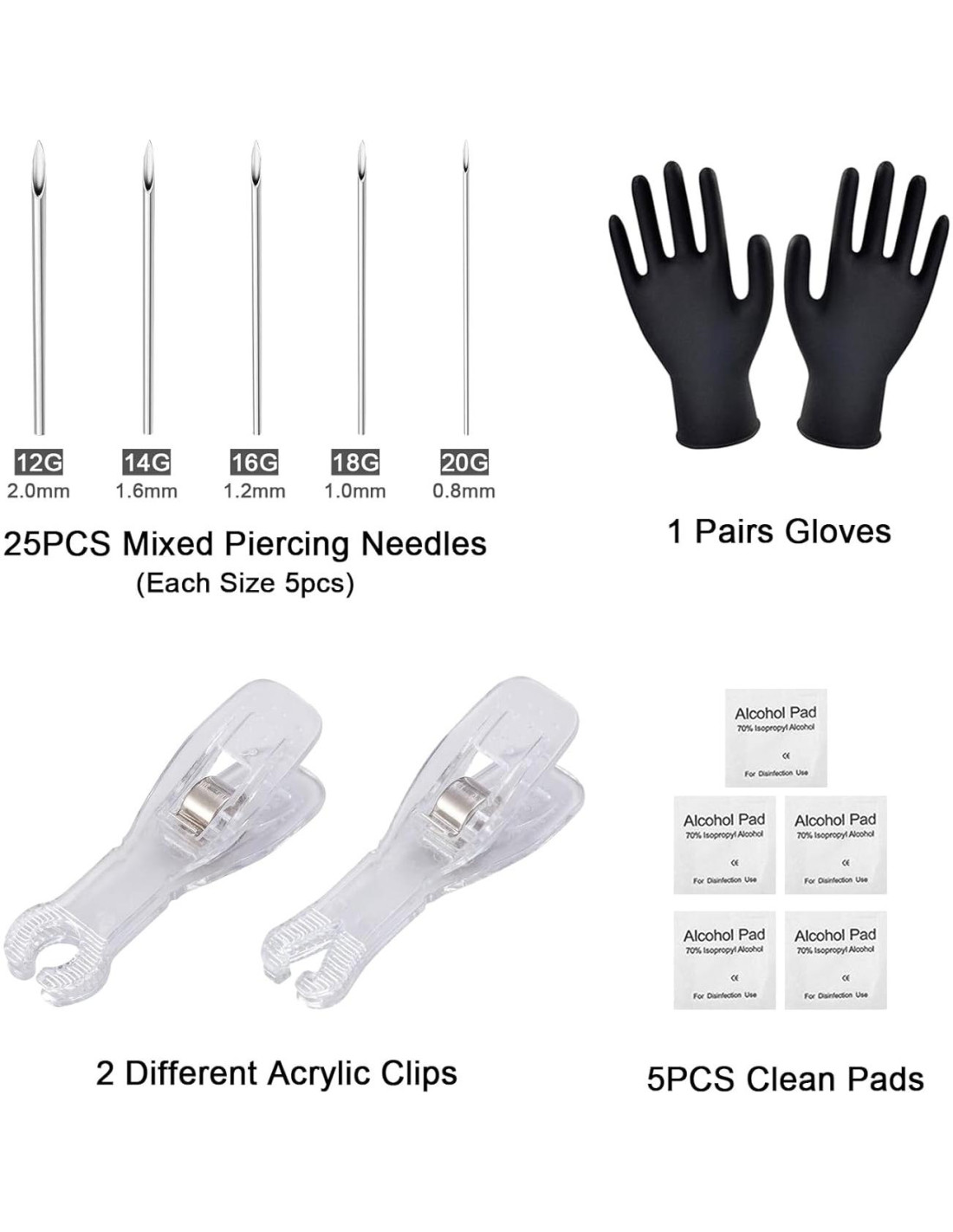 - Kit de Piercing Profesional - Kit de piercing completo con 25 agujas de piercing de diferentes calibres (12G-20G), 2 clamps de piercing desechables (redondos/triangulares), guantes y 5 almohadillas de preparación.