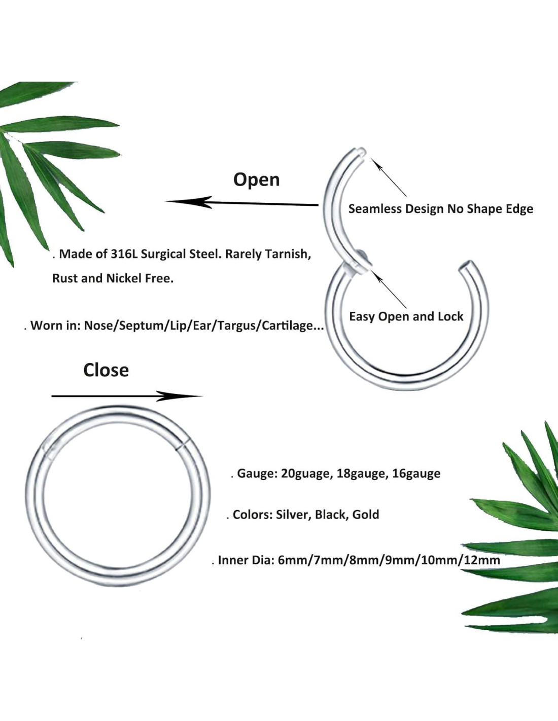- Fácil de Abrir y Cerrar: Sostenga el aro nasal con bisagra con ambas manos, luego apriete o tire del aro para conectar o abrir. No se necesitan herramientas. Además, el aro nasal clicker es ligero y lo suficientemente ajustado para usar durante mucho tiempo, sin ninguna incomodidad