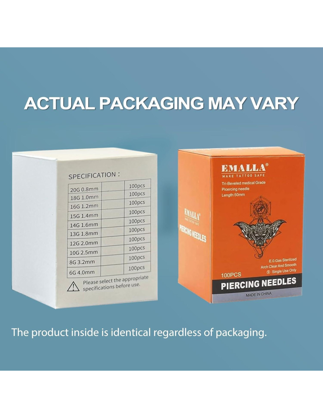 - INCLUYE PAQUETE - 100pcs agujas de piercing, 20pcs de cada tamaño en 12G 14G 16G 18G 20G. Todas las agujas de piercing están empaquetadas y selladas individualmente, para uso desechable solamente