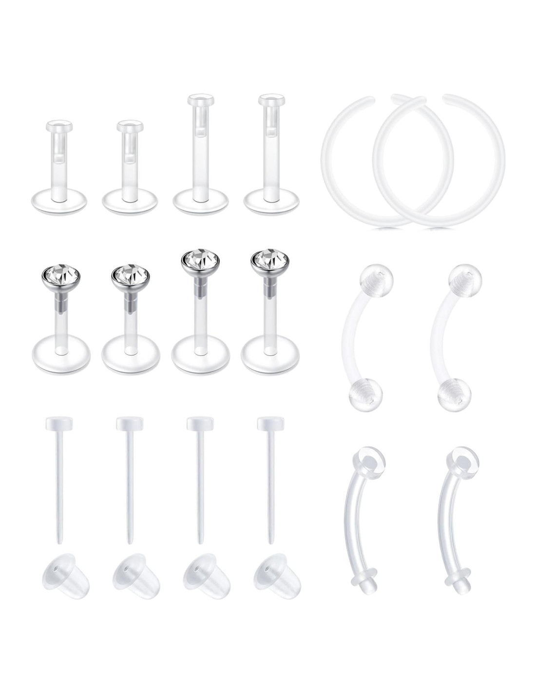 - El paquete incluye - pendientes transparentes retenedor de pendientes 4pcs + aro de pendiente transparente 2pcs + pendiente de cartílago transparente (anillo de labio transparente) 8pcs + pendiente de rook transparente (anillo de ceja transparente) 4pcs;