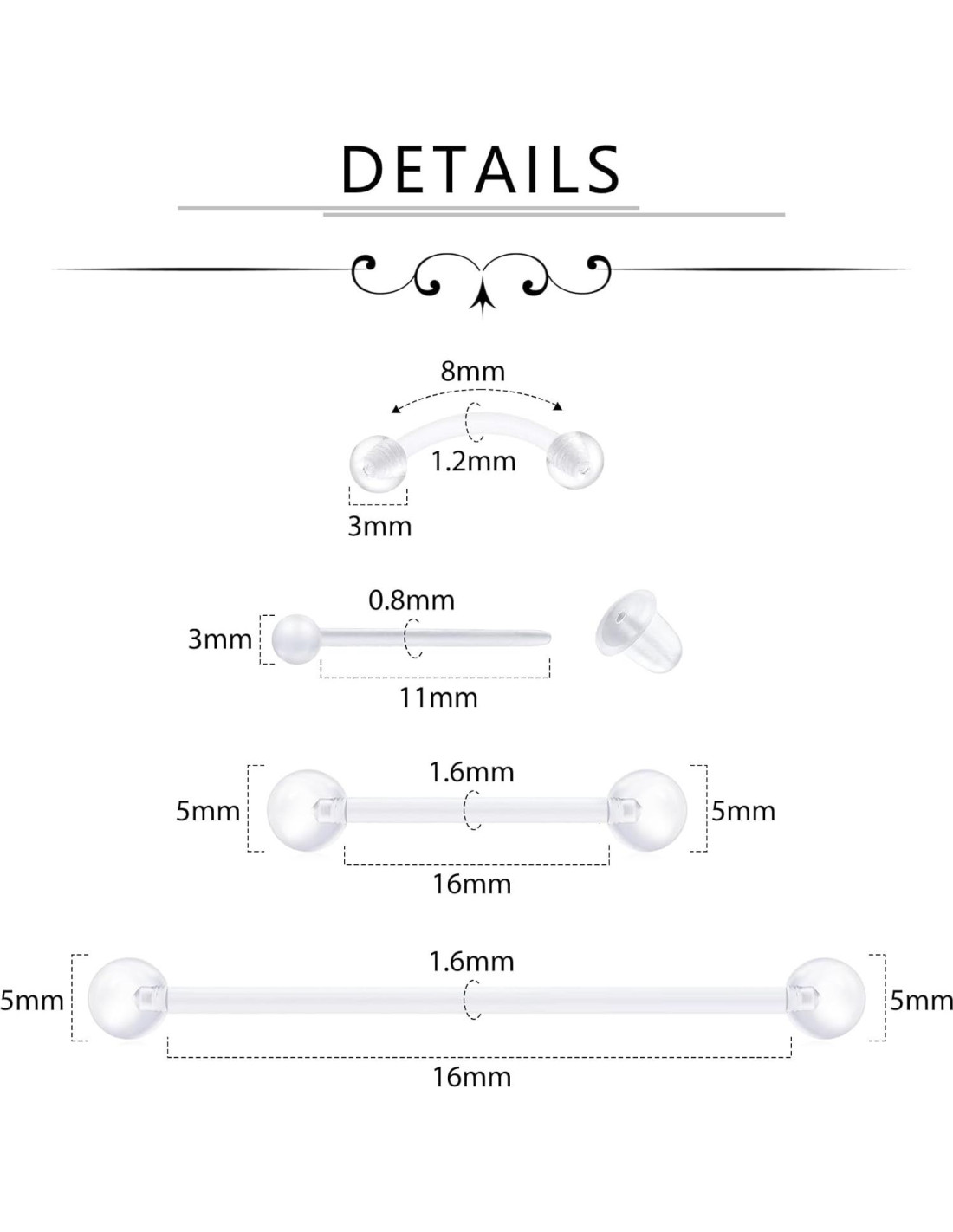 - [Tamaño] * Forma de U: 16g(1.2mm), longitud de la barra: 6mm(1/4"); * anillos en forma de herradura, anillos para cejas y anillos clicker: 16g(1.2mm), diámetro interno y longitud de la barra: 8mm(5/16"); * pernos claros para aretes: 20g(0.8mm), longitud de la barra: 11mm; * barra industrial clara: 14g(1.6mm), longitud de la barra: 38mm(1 1/2"); * retenedor de anillos para lengua: 14g(1.6mm), longitud de la barra: 16mm; * pernos claros para nariz: 18g(1.0mm), longitud de la barra: 7mm; * anillos claros para ombligo: 16g(1.2mm), longitud de la barra: 10mm;