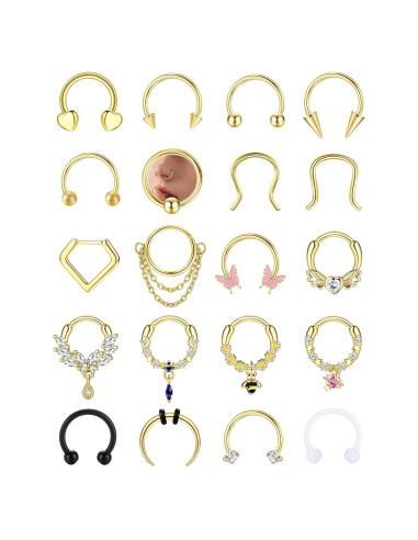 - 20 Estilos de Anillos de Septum: Un conjunto de 20 piezas de anillos de septum para mujeres y hombres, incluyendo joyería de piercing en forma de corazón, anillo de nariz de aro CZ, anillos de septum de cadena colgante, joyería de septum de abeja, anillo de septum de acrílico, etc. Tres colores para tu elección: plata/negro/dorado. Estilos y colores ricos ofrecen una variedad de opciones para tu atuendo.