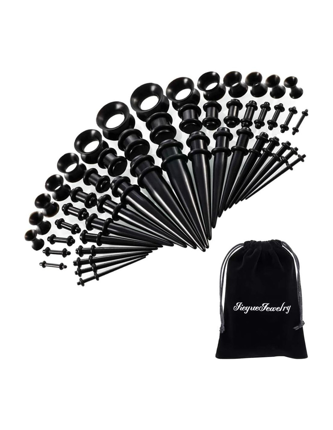 Estira tus orejas con nuestro kit de medidores de 50 piezas que incluye: 9 Pares de Tapers Rectos de Acrílico con 2 Anillos de Goma Negros: 14G (1.6mm), 12G (2mm), 10G (2.5mm), 8G (3mm), 6G (4mm), 4G (5mm), 2G (6mm), 0G (8mm), 00G (10mm) 9 Pares de Tapones con 2 Anillos de Goma Negros: 14G (1.6mm), 12G (2mm), 10G (2.4mm), 8G (3.2mm), 6G (4mm), 4G (5mm), 2G (6mm), 0G (8mm), 00G (10mm) 7 Pares de Túneles de Silicona: 8G (3mm), 6G (4mm), 4G (5mm), 2G (6mm), 0G (8mm), 00G (10mm) 0.47pulgadas (12mm) Estira tus orejas con nuestro kit de tapers. Estirar tus orejas puede ser costoso, pero con estos kits de estiramiento obtienes una gran oferta porque obtienes los tapers para cada tamaño, así como un buen kit de tapers de oreja de calidad para cada oreja. Nos esforzamos por ofrecerte la joyería de la más alta calidad a precios inmejorables. Por eso estamos seguros de que estarás más que satisfecho con nuestros servicios.