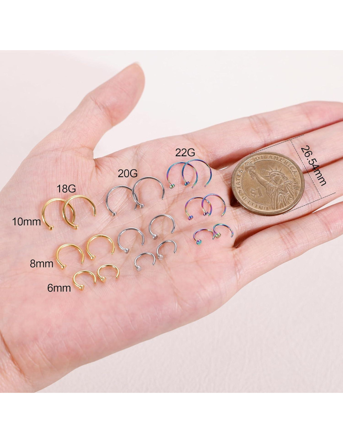 - TAMAÑO DE GAUGE: 18G (1.0mm), diámetro interno: 6mm+8mm+10mm. Múltiples opciones de tamaño, permitiéndote elegir el tamaño más adecuado para ti. Estas perforaciones de nariz son lo suficientemente ligeras para usarlas todo el día sin incomodidad.