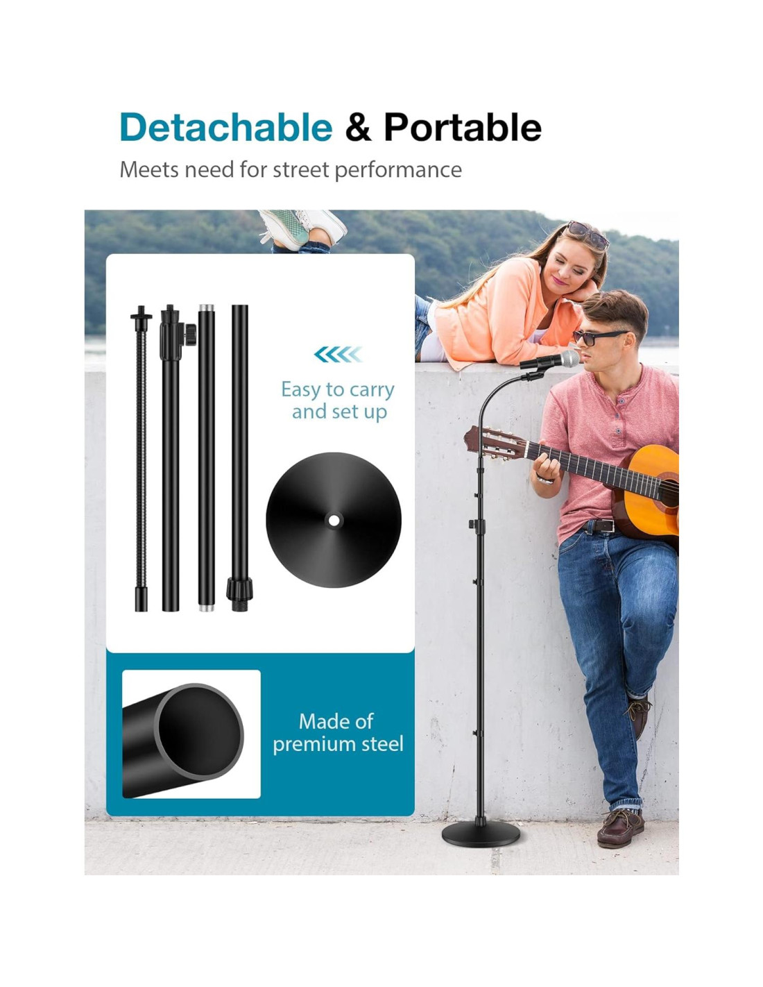 - Soporte Desmontable y Portátil: Este soporte de piso con cuello de ganso se puede desmontar en cuatro partes en segundos. Es fácil de llevar e instalar, lo que proporciona una gran conveniencia para varios tipos de actividades como escenario, estudio, espectáculo en la calle, concierto, actuaciones al aire libre y más.