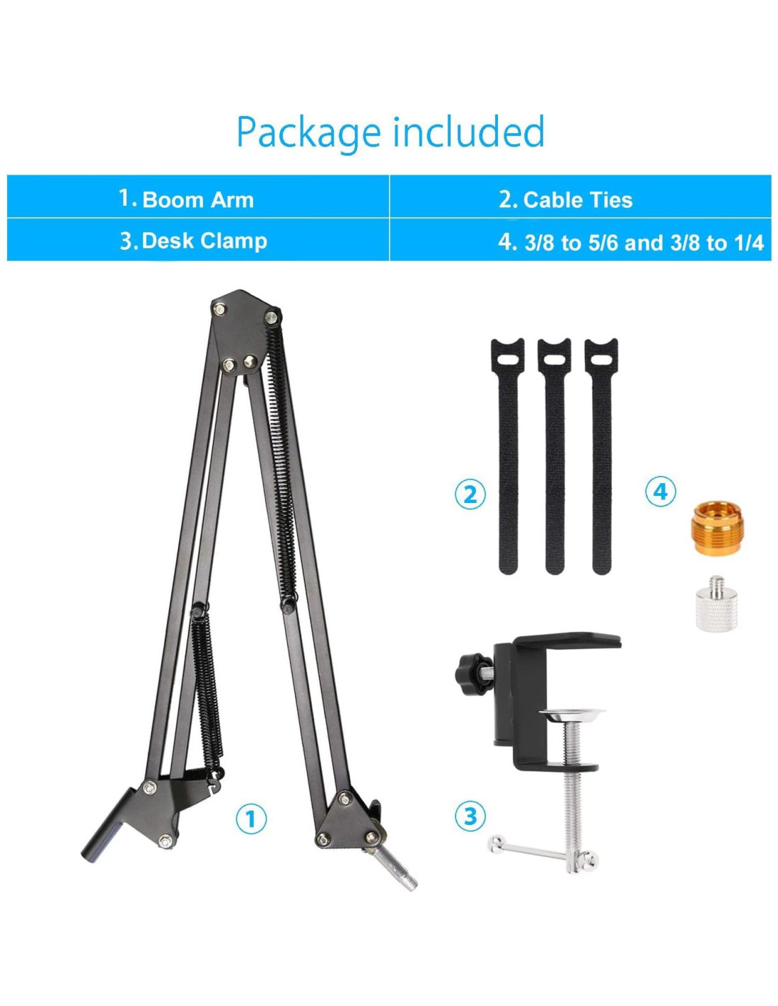 Brazo boom*1; Abrazadera de escritorio*1; Clip de micrófono*1; Adaptador de 3/8" a 5/8"*1; Bridas*3