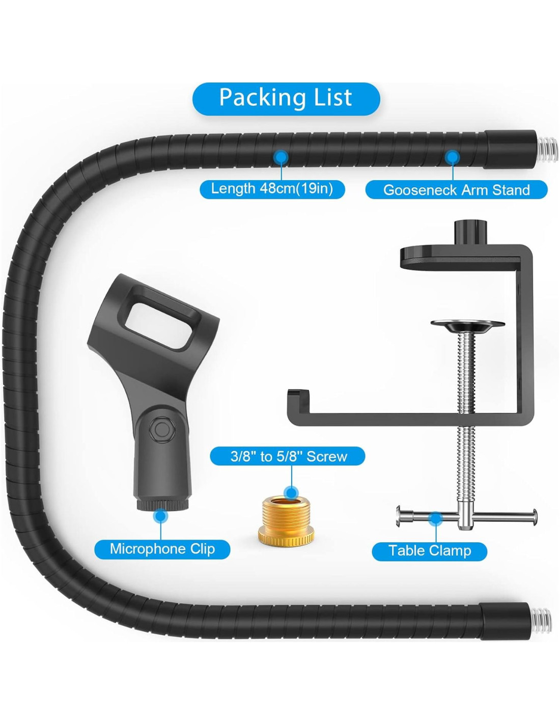 - [Paquete Completo] 1 x soporte de brazo de micrófono flexible de 48.26 cm (19 pulgadas) con una abrazadera de escritorio de aleación de aluminio, 1 x adaptador de tornillo de 3/8" a 5/8", 1 x soporte para micrófono que puede sostener de forma segura micrófonos de mano con un diámetro máximo de hasta 3.5 cm (1.38 pulgadas). Por favor, ten en cuenta que la abrazadera de escritorio cuenta con dos agujeros de 1/4", permitiéndote montarla en la pared con el tornillo de 1/4" (tornillos no incluidos).