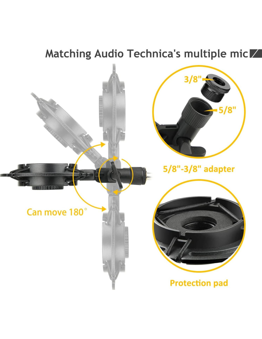 - Montaje de Choque Mejorado - El montaje de choque de metal de alta calidad tiene un mejor efecto de absorción de impactos y puede reducir el ruido de vibración innecesario. Como golpear en el suelo, golpear en el escritorio, etc. Mejora la calidad de grabación. Viene con adaptador de tornillo de 3/8"-5/8". Se ajusta perfectamente a la mayoría de los soportes de brazo y soportes de micrófono.