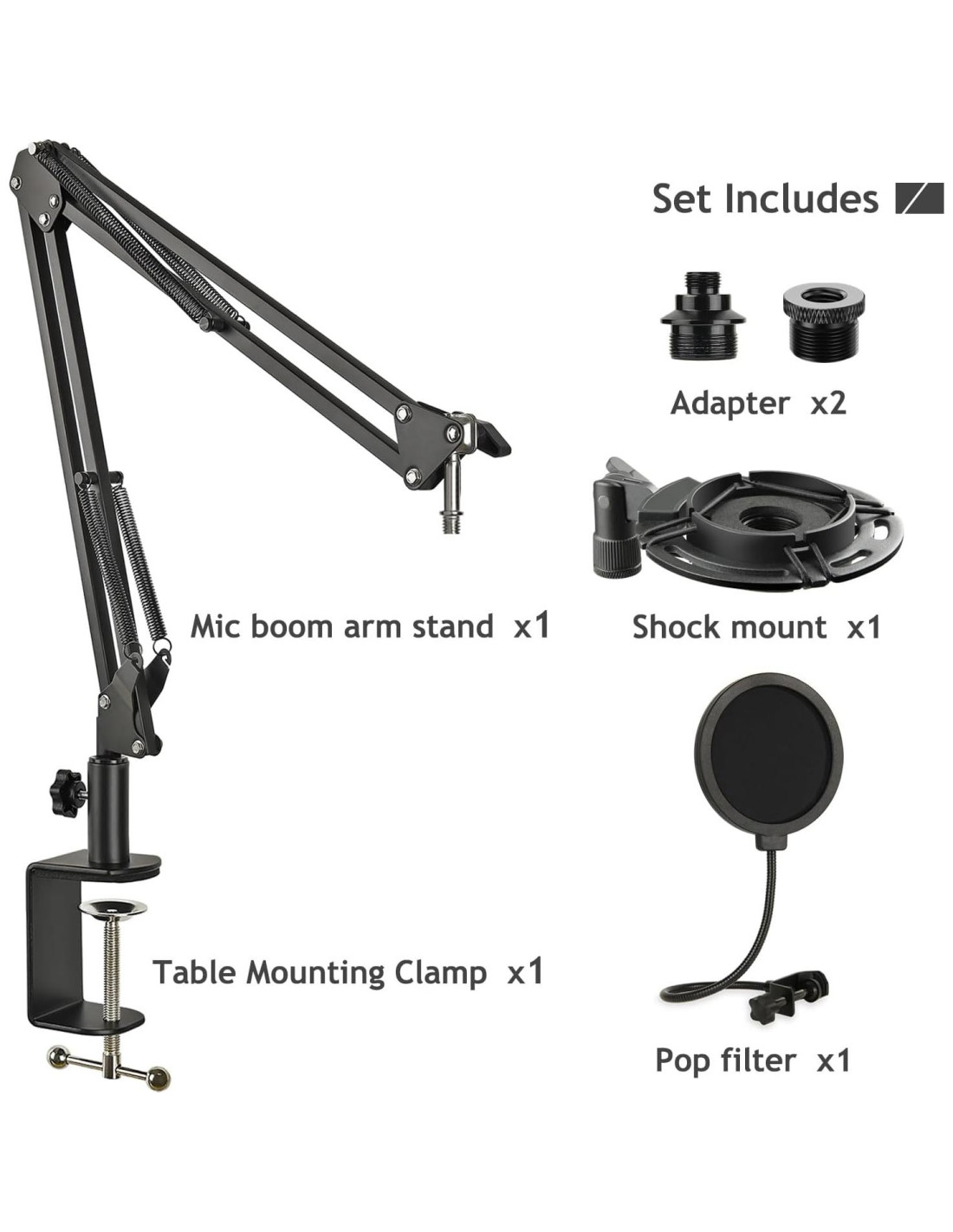 - Todo en Uno - 1x Filtro Antipop, 1x Soporte de Brazo de Tijera para Micrófono, 1x Abrazadera de Montaje en Mesa, 1x Montaje de Choque, 1x Adaptador de Tornillo de 3/8 hembra a 5/8 macho, 4x Bridas. Ideal para tu grabación, videos de YouTube, podcasting, juegos en línea o trabajo de voz.