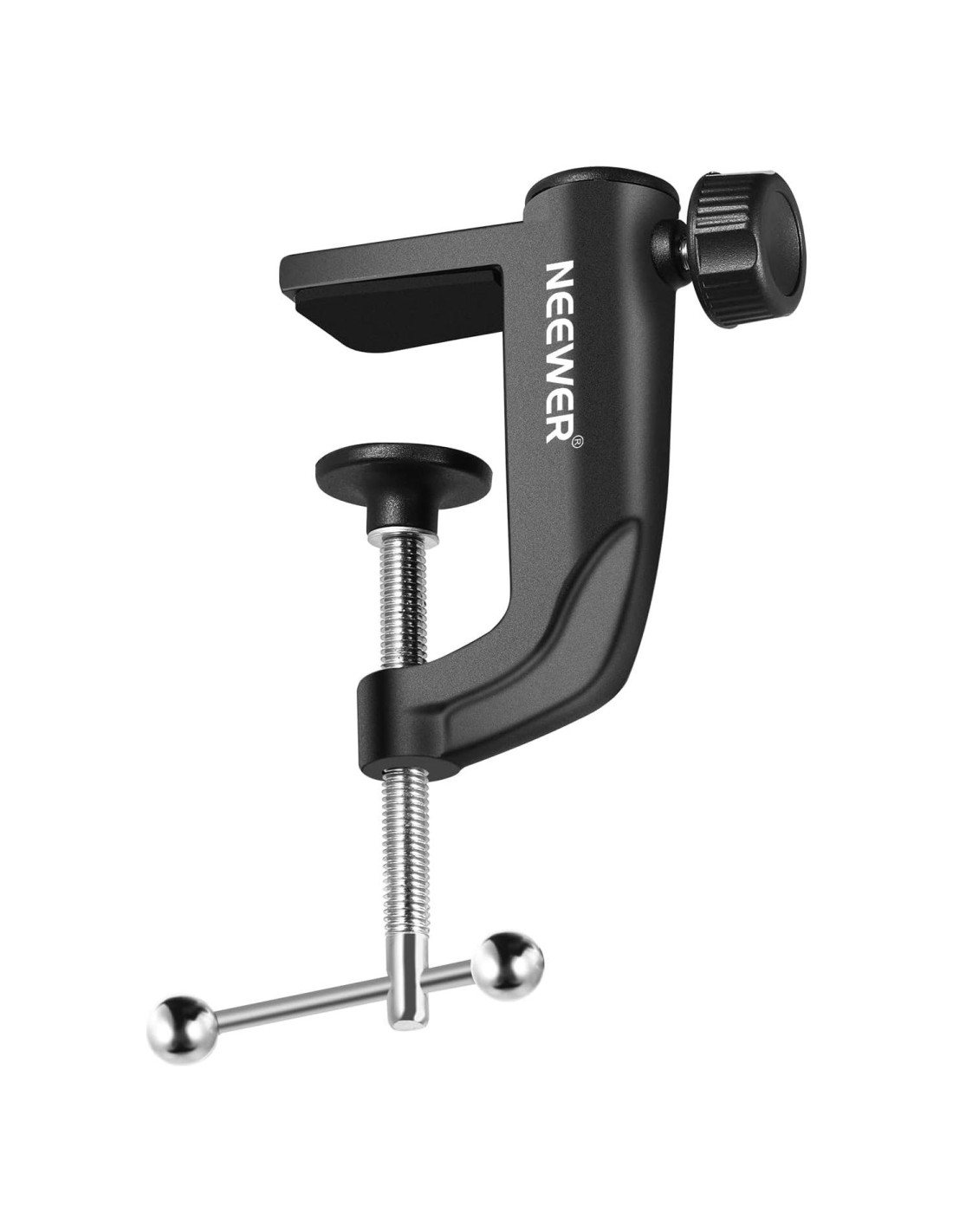 - La abrazadera de montaje en mesa ajustable está diseñada para montar de forma segura tu soporte de micrófono en la parte superior de la mesa u otra superficie plana utilizando un tornillo de posicionamiento ajustable